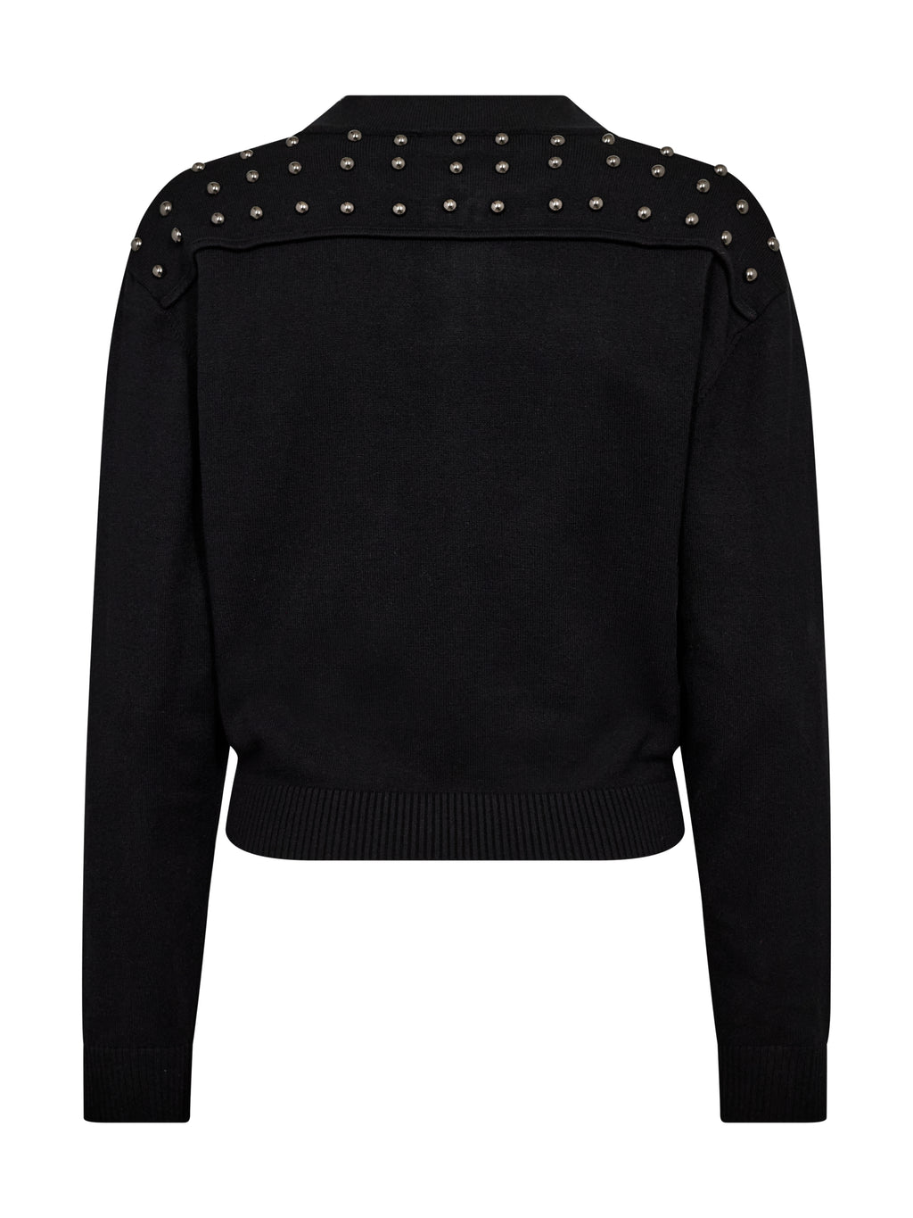 This cardigan has a short and fitted cut with long sleeves and a round neck. It fastens at the front with a zipper, while decorative stud details along the sides give a striking look. The back is designed with studs across the shoulders, adding extra character and creating a beautiful overall style. Style the cardigan over a simple top or dress, or use it as a layered look for everyday wear.