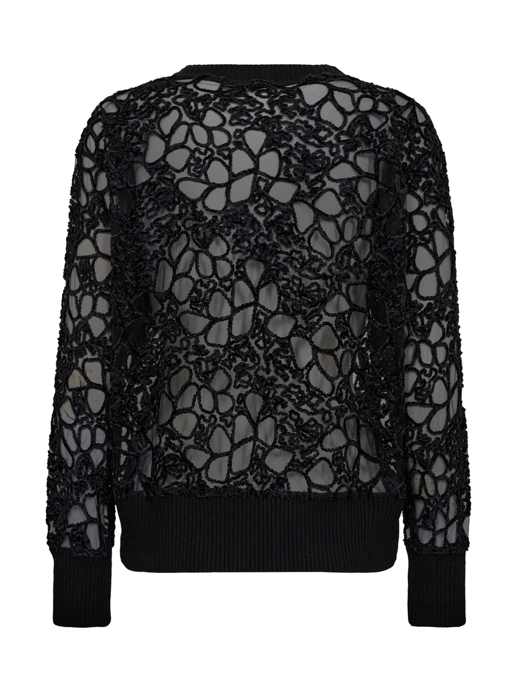 This blouse has a light and transparent expression with a floral lace pattern that creates a subtle play. The front is simple with a round neck and long sleeves, while the back follows the same pattern, creating a cohesive whole. Style it over a simple top and pair it with loose pants or a skirt for a relaxed yet sophisticated everyday look.