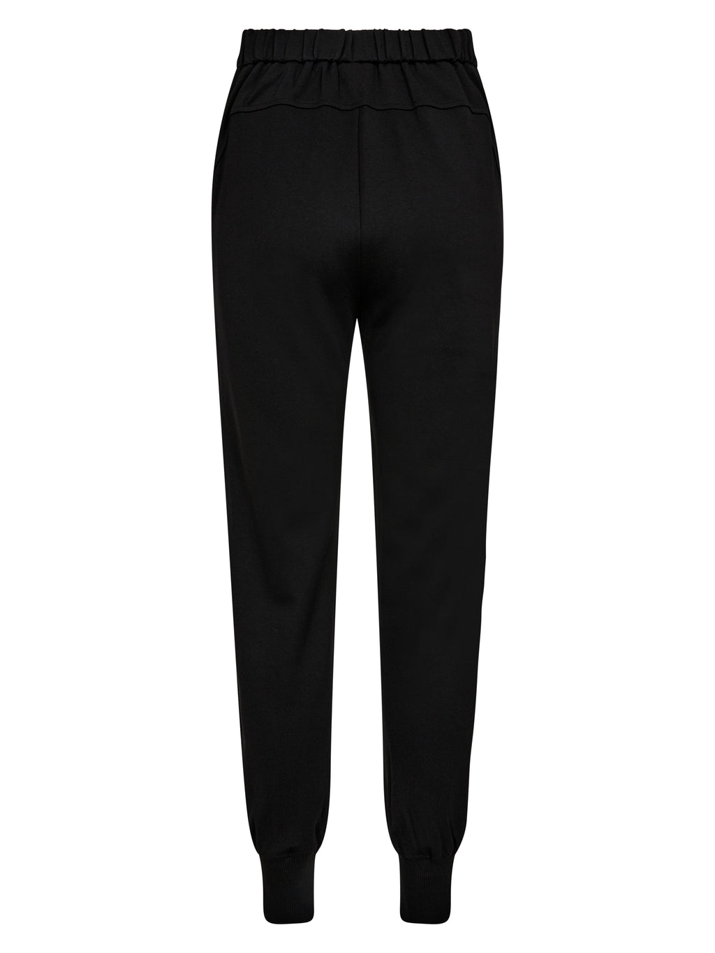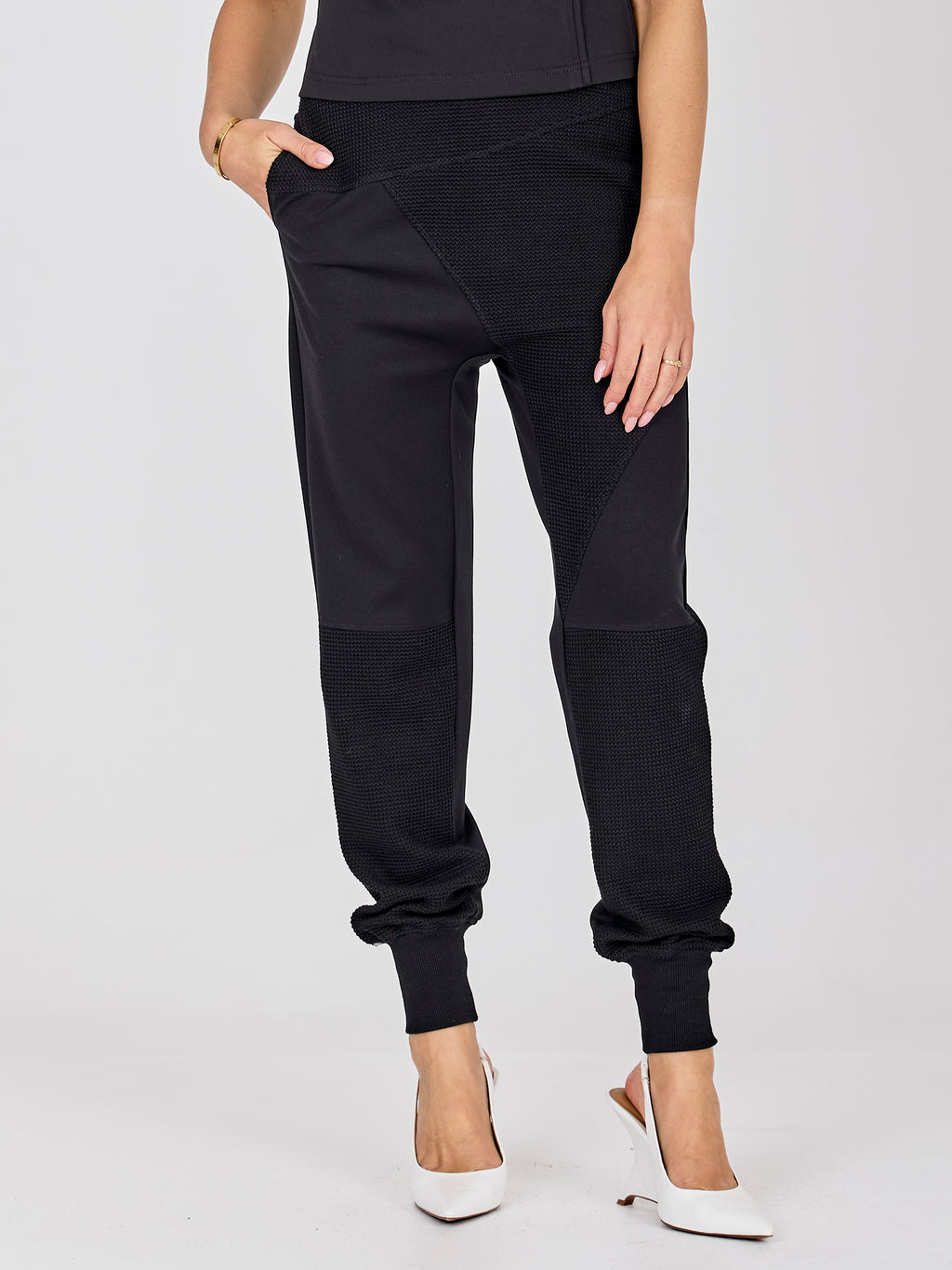 These pants have a relaxed yet striking look with a slim fit that softly gathers at the ankles. The front is divided into contrasting materials and slanted lines, providing a raw and modern feel, while the pockets are conveniently placed at the sides. The back is more straightforward with an elastic waistband to ensure comfort all day long. The pants work well for both everyday wear and more laid-back occasions. Style them with a simple top or sweater for a cool and versatile look.