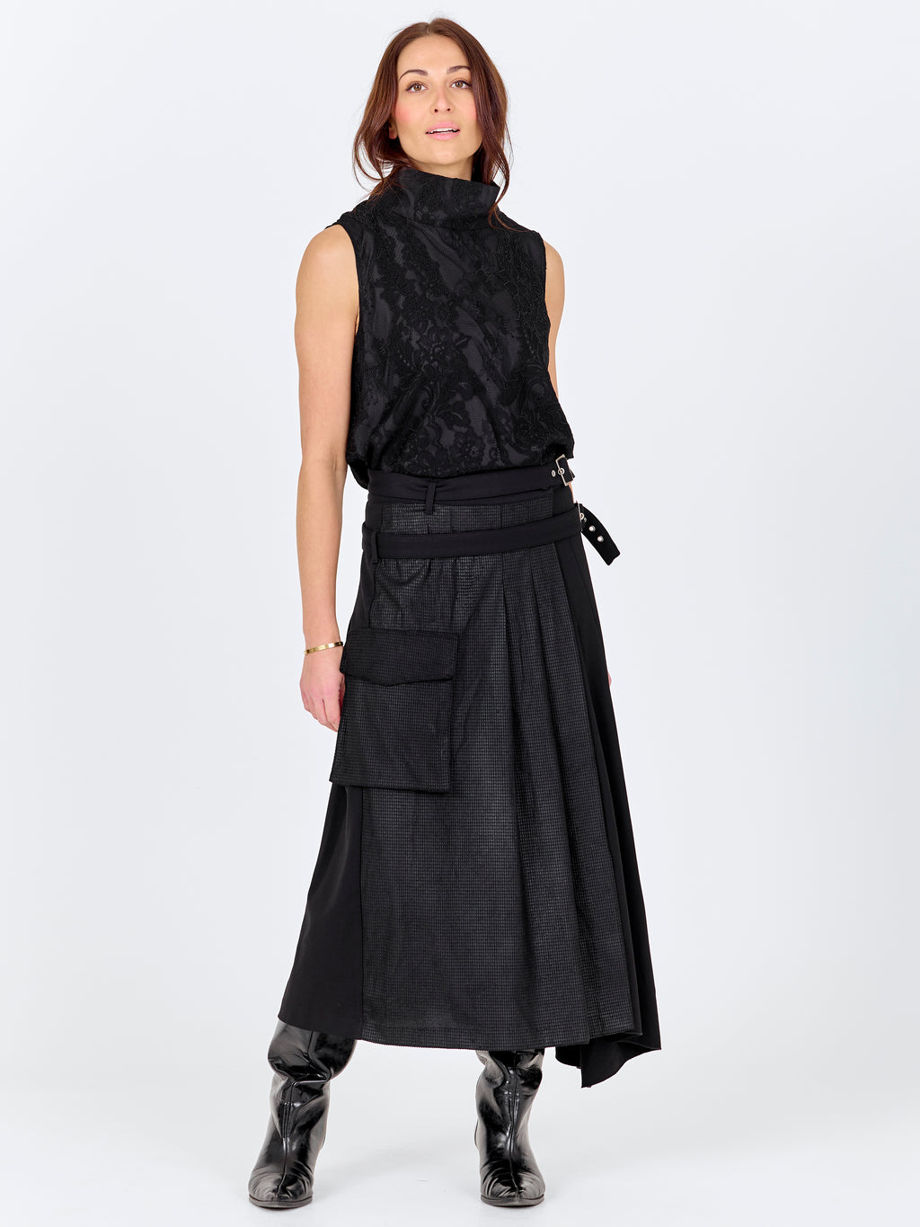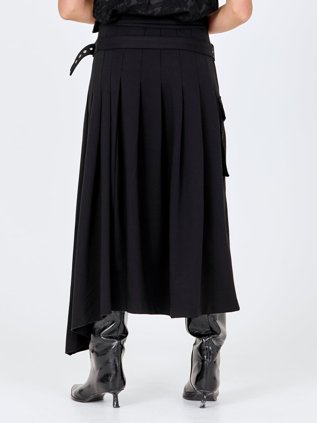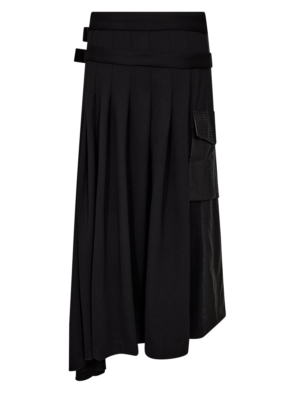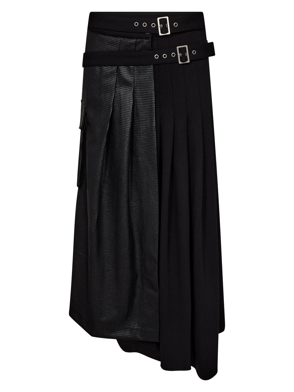 This skirt has a striking and modern expression with a combination of pleats and contrasting materials that give plenty of character. The front is divided in two, where one side is smoother, while the other has structure and folds that create movement. The waist is finished with adjustable buckles that are both functional and add a raw touch. The back falls gently and balances the design. Style the skirt with a simple top or knit for a cool and considered everyday look.