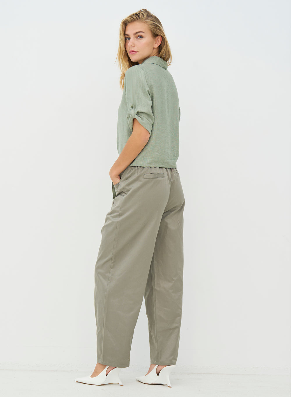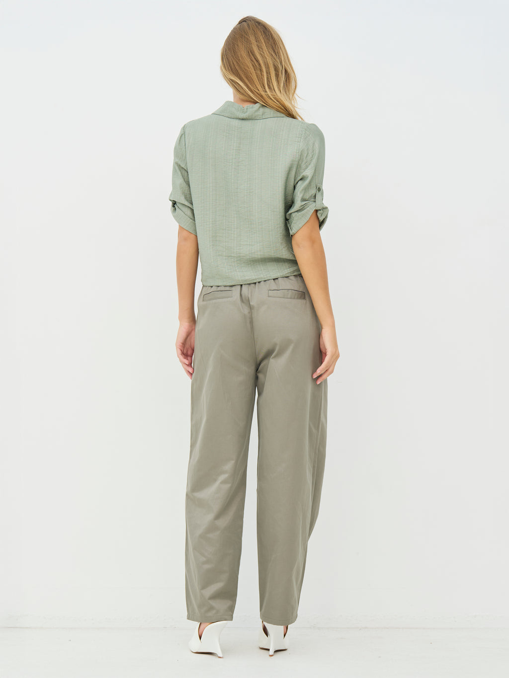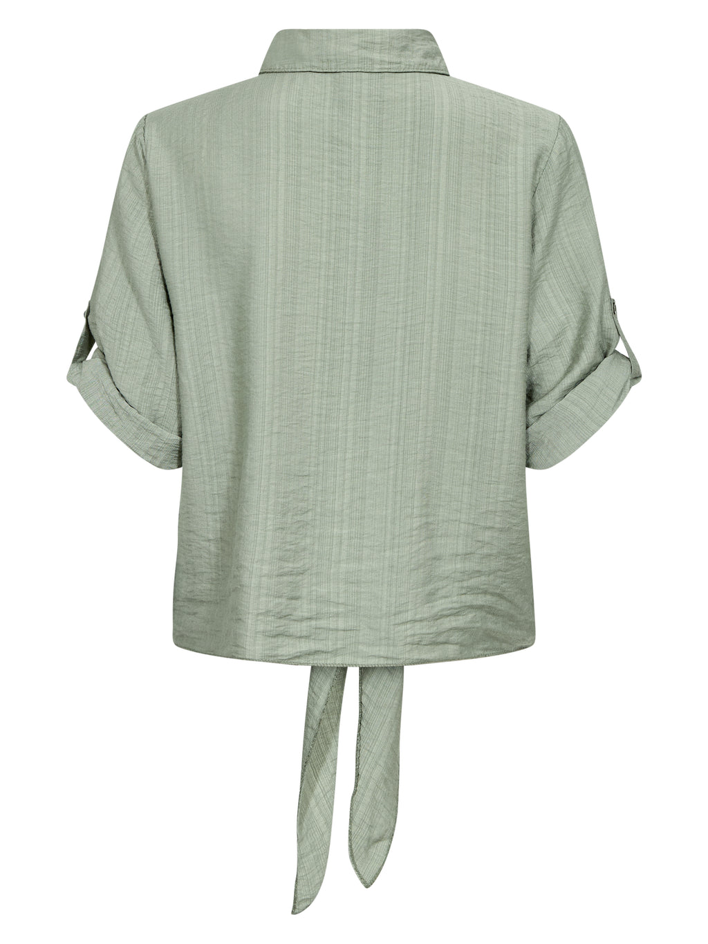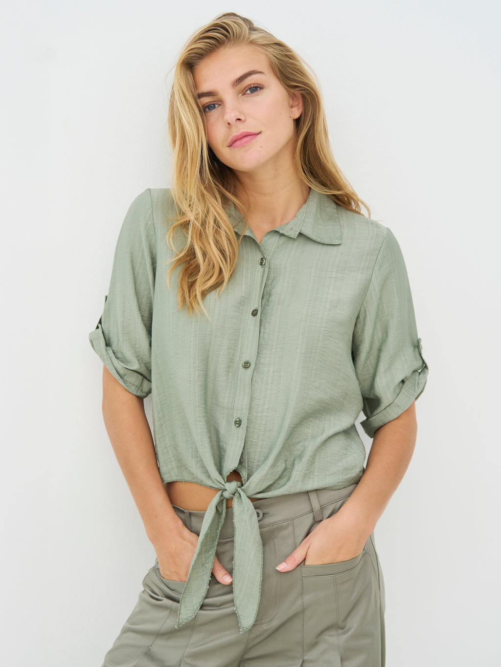 This shirt has a light and relaxed look with short sleeves that can be rolled up and fastened with a loop. It closes at the front with buttons and finishes with a decorative tie detail, giving it a feminine touch. The back is simple and straight in cut. Style the shirt with loose trousers, a skirt, or shorts for a casual everyday look, or wear it open over a simple top on warm days.