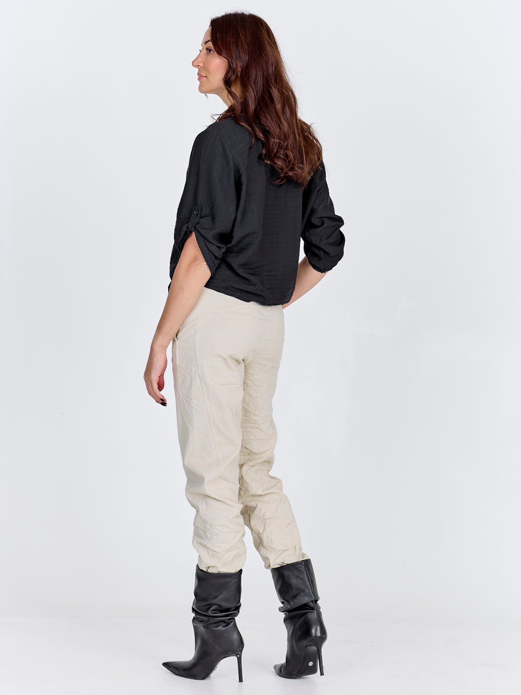 This shirt has a light and relaxed look with short sleeves that can be rolled up and fastened with a loop. It closes at the front with buttons and finishes with a decorative tie detail, giving it a feminine touch. The back is simple and straight in cut. Style the shirt with loose trousers, a skirt, or shorts for a casual everyday look, or wear it open over a simple top on warm days.