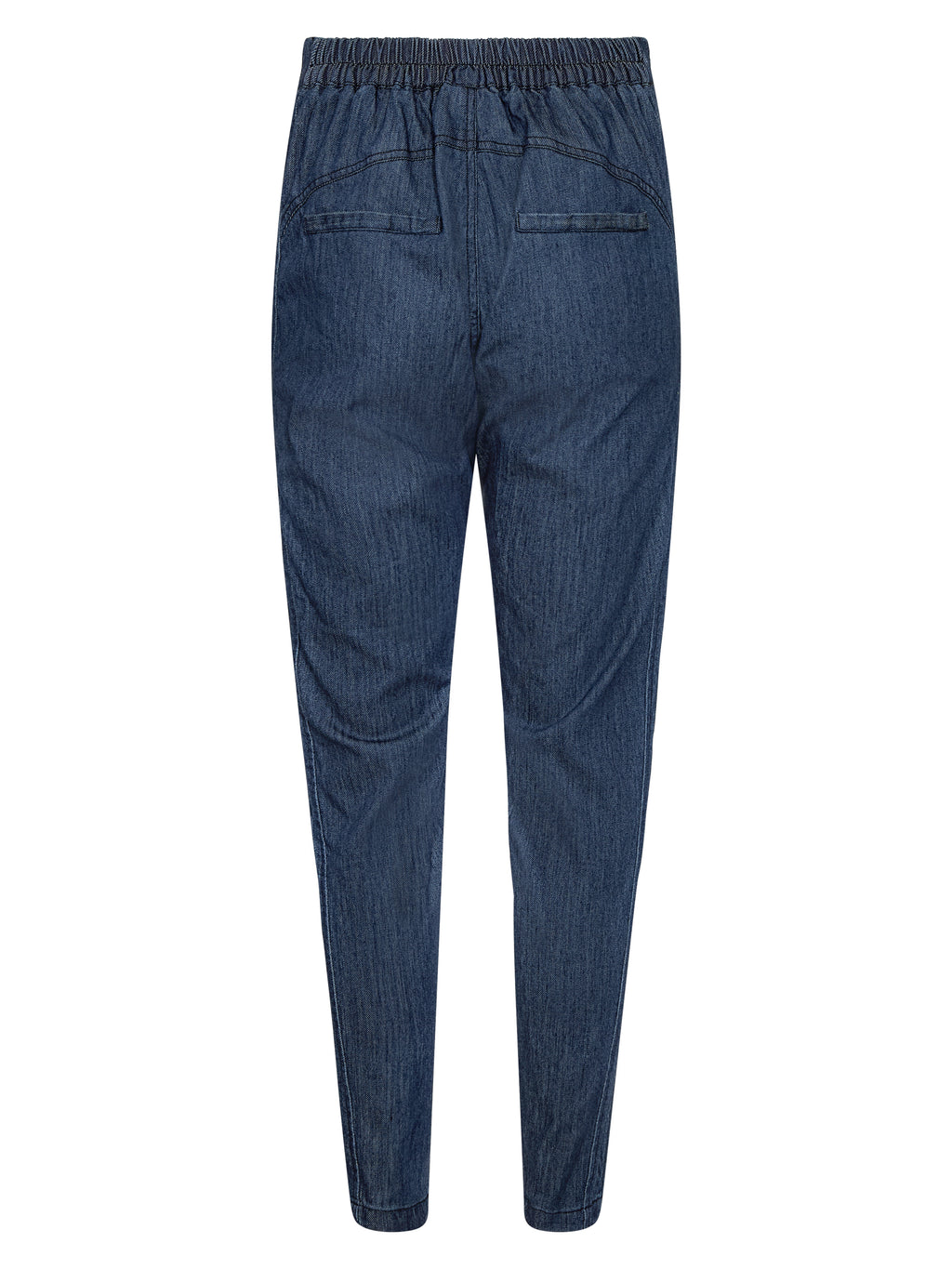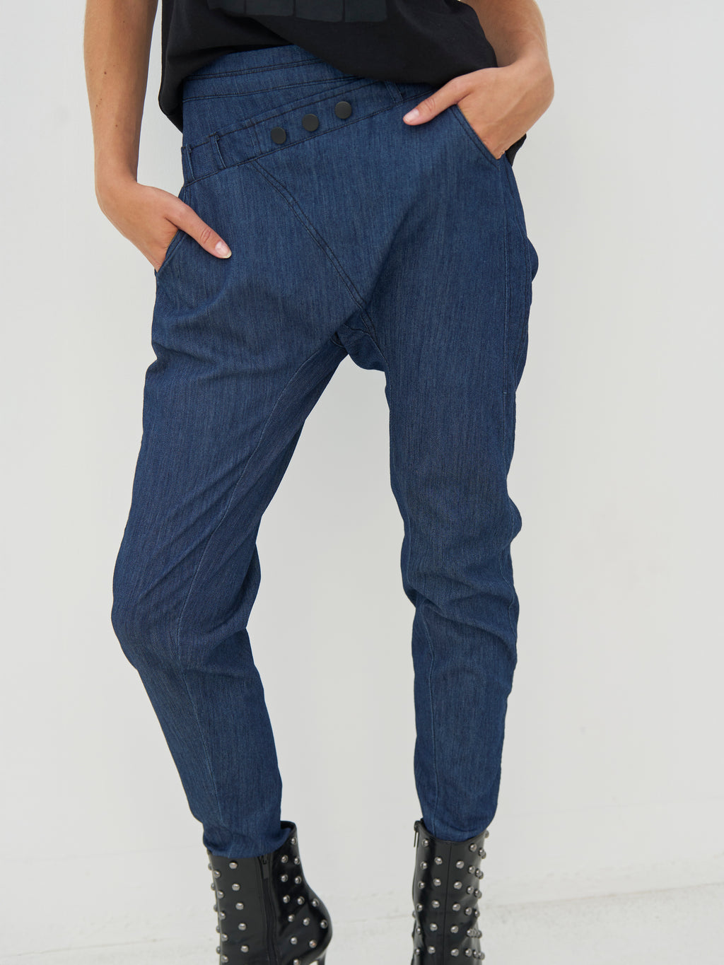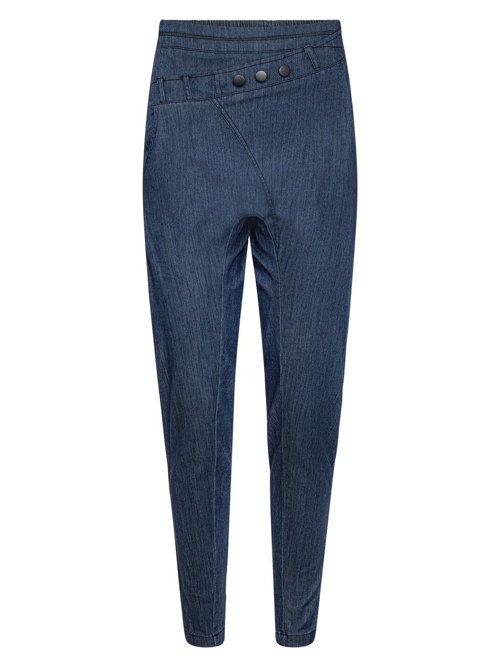 These denim trousers have a simple cut with slim legs, giving a neat and relaxed look. At the front, there is an angled detail with buttons at the waist, adding a little extra edge to the trousers, while the back is kept classic and calm. The trousers are easy to wear in everyday life and can be styled with a simple top, shirt, or knit, depending on the look you desire.
