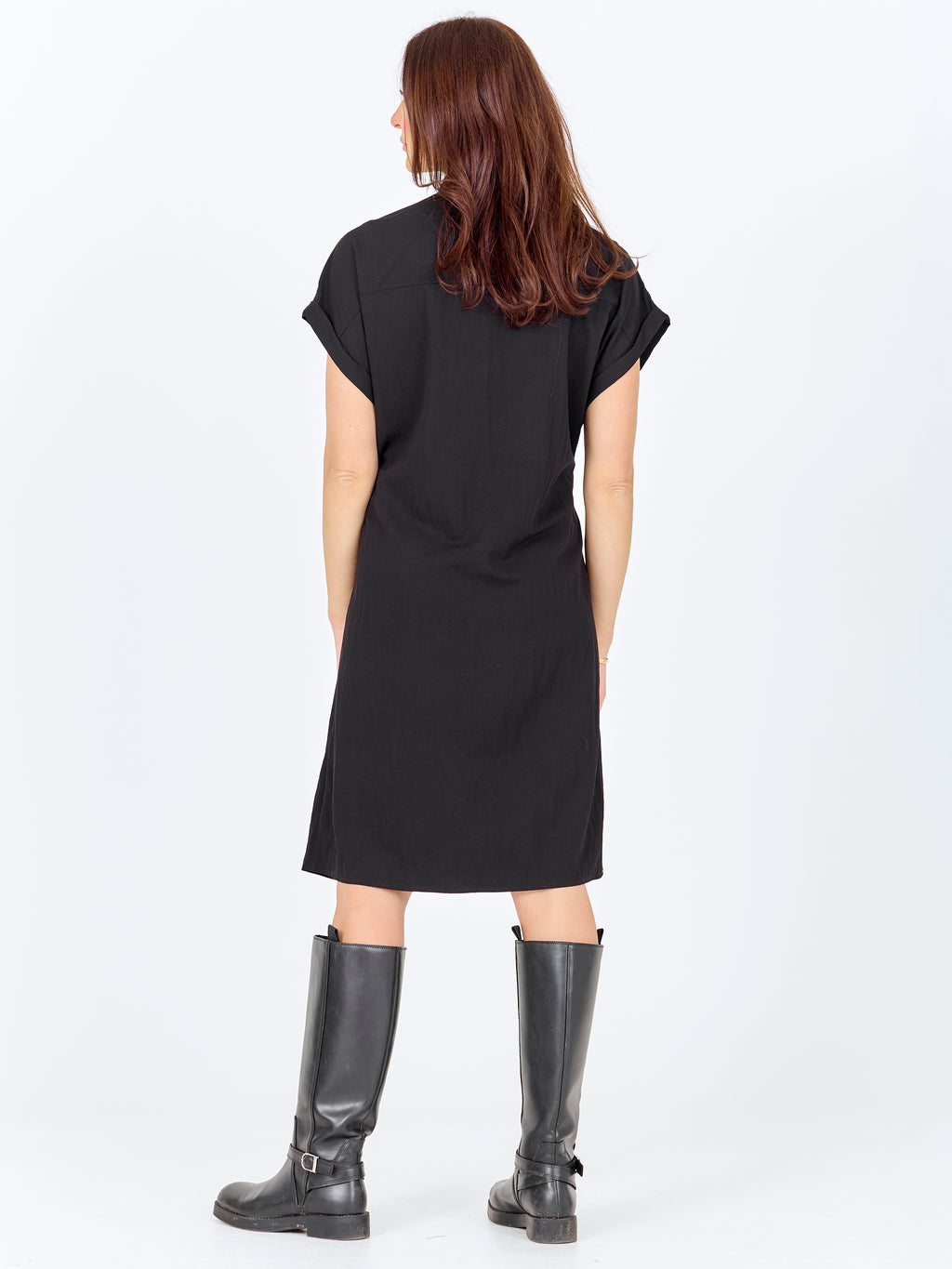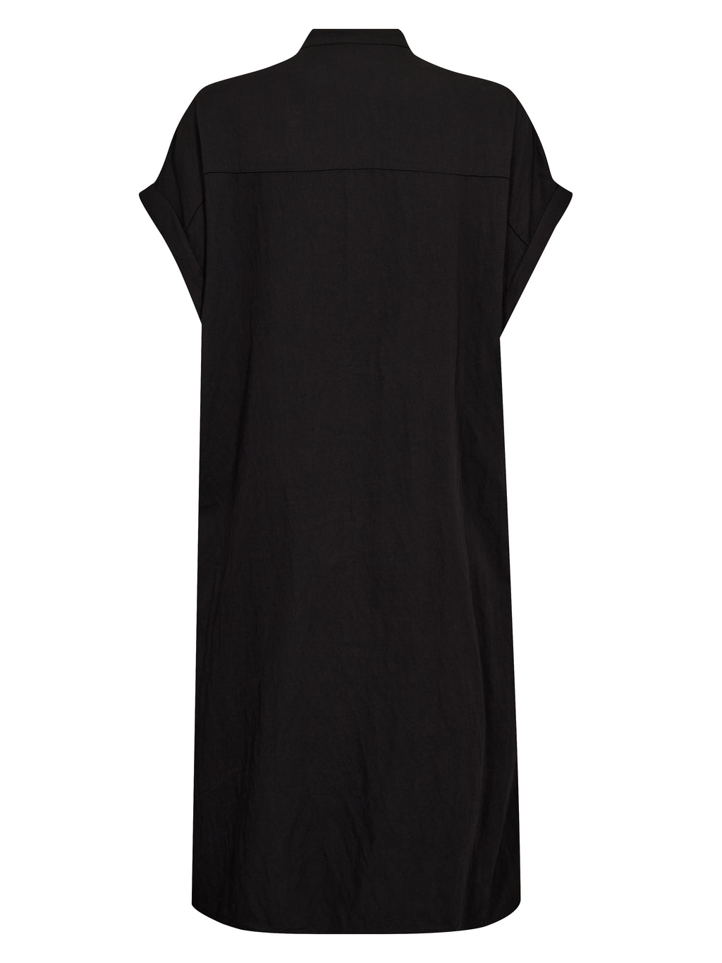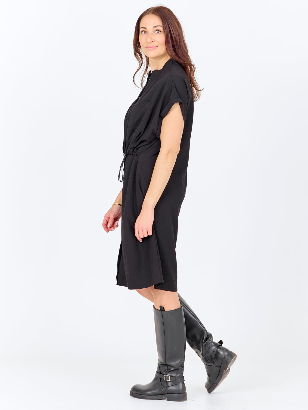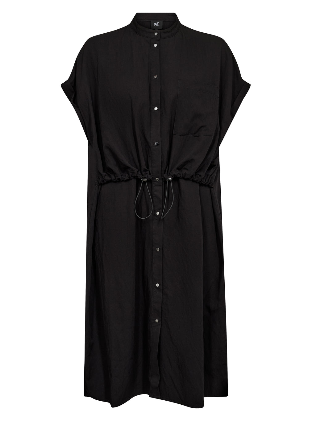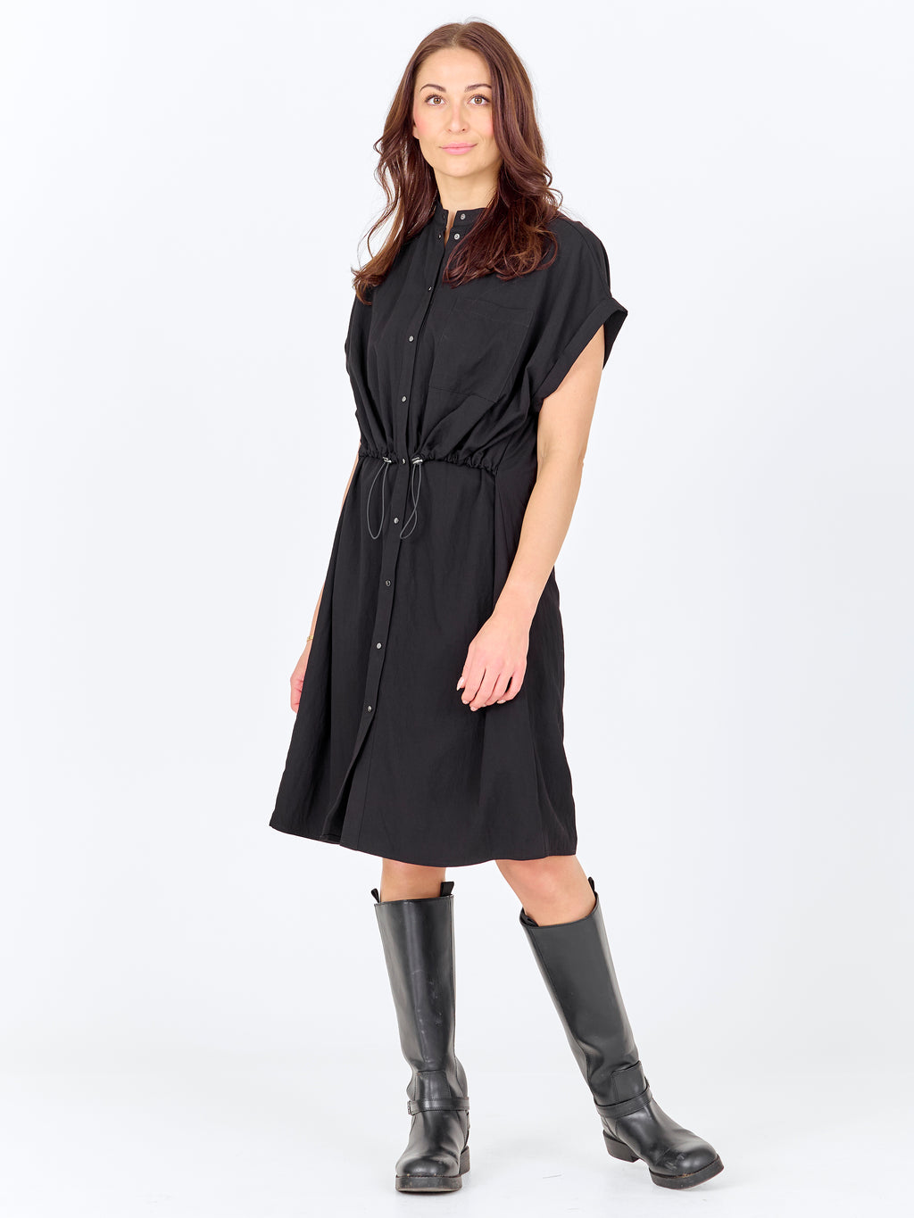 This dress has a relaxed and simple look with short sleeves and a button closure all the way down the front. The high collar gives a clean look, while the drawstring at the waist can be adjusted to easily gather the dress. In the front, the dress has a chest pocket, and at the back, the design is more straightforward with a straight fall. The dress can be styled both closed as a dress or slightly open over pants for a more casual look.