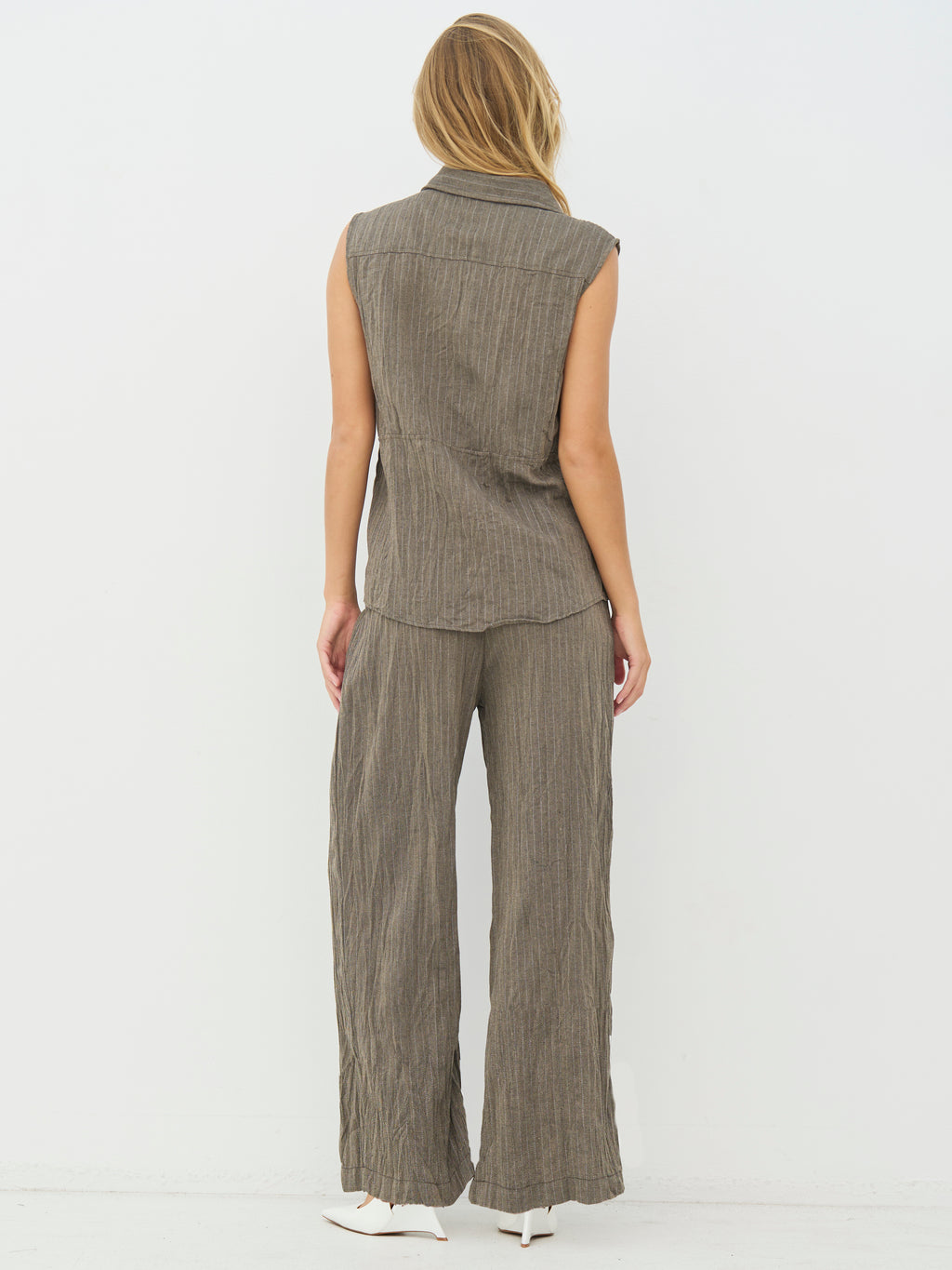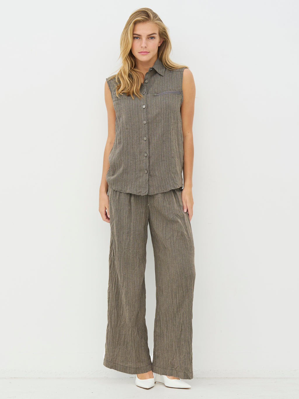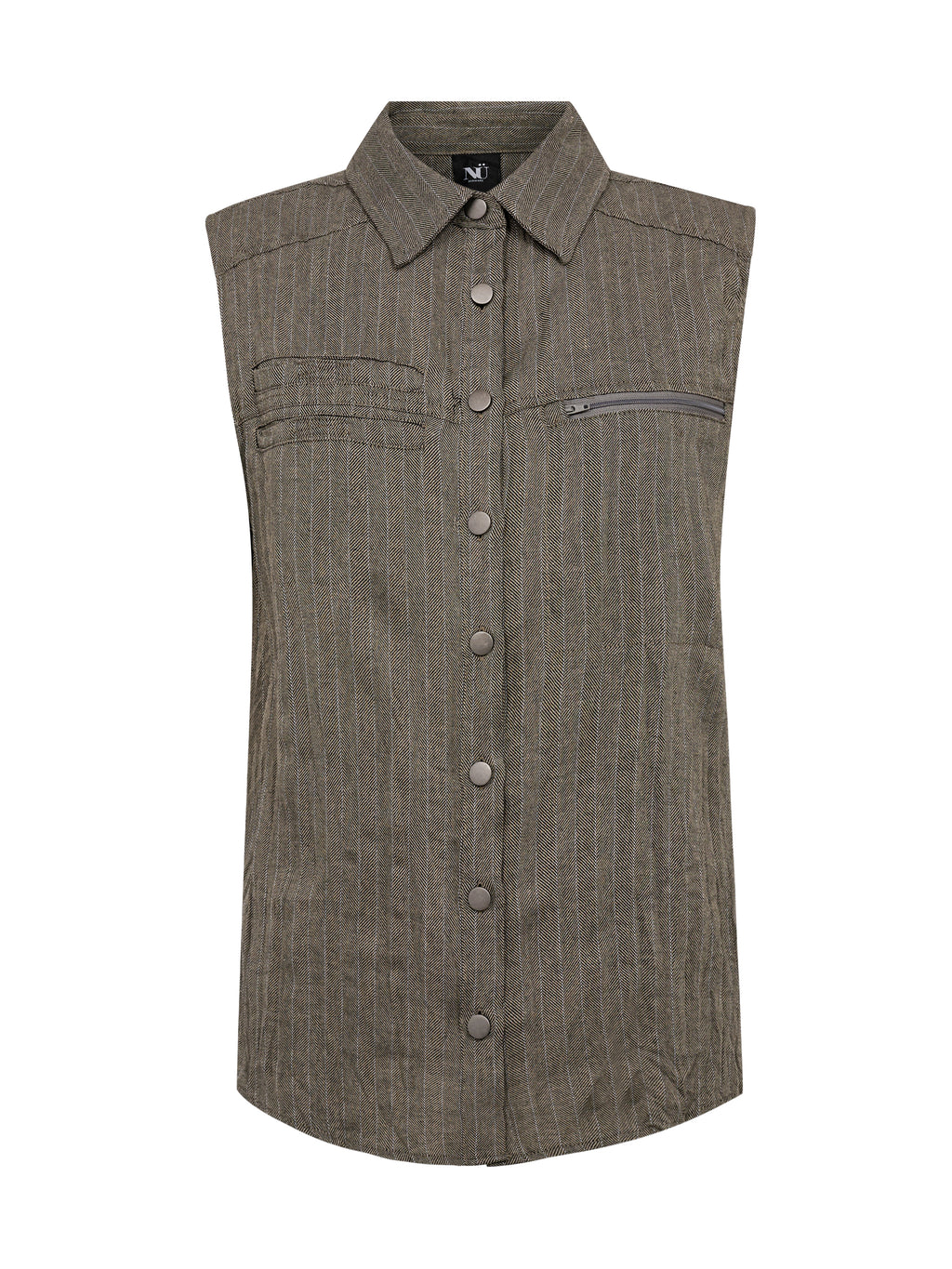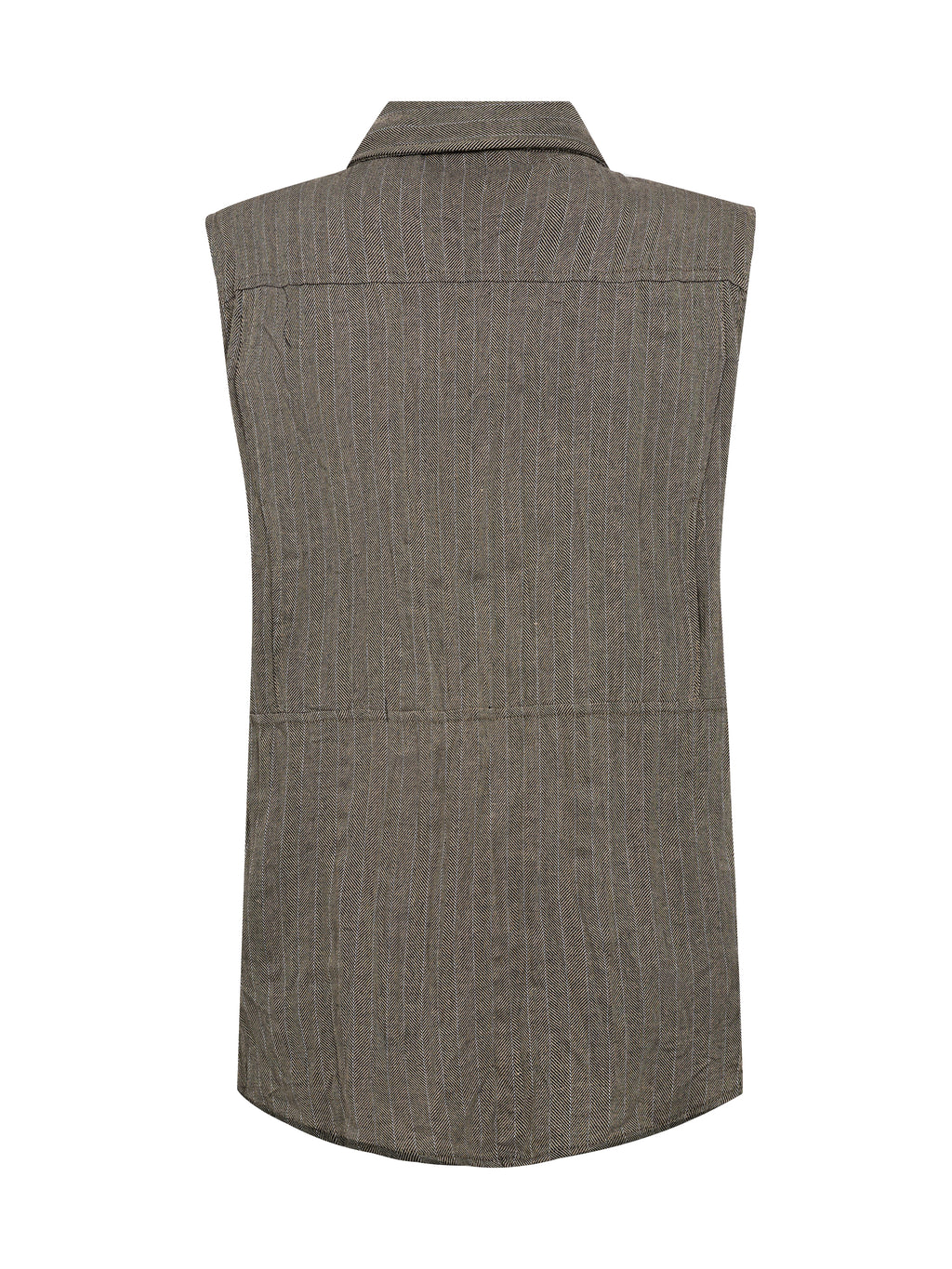 This sleeveless shirt has a simple and slightly raw look with a classic collar and full snap buttons down the front. The vertical structure of the fabric adds depth, while the zip pocket on the chest introduces a functional and distinctive element. The back is more straightforward and falls straight down, providing a comfortable fit. Wear it alone, closed or slightly open, or style it with the matching trousers for a complete set.