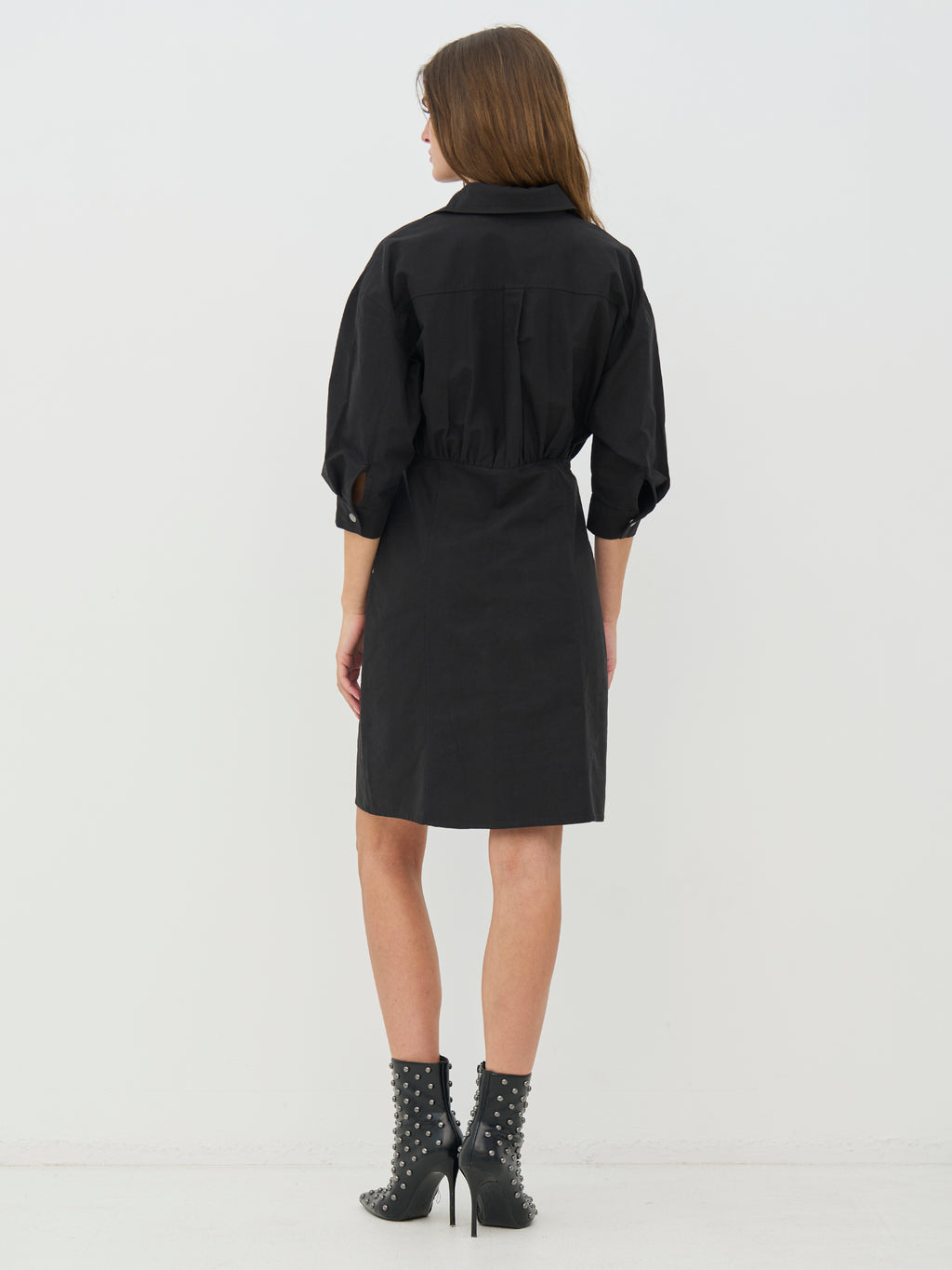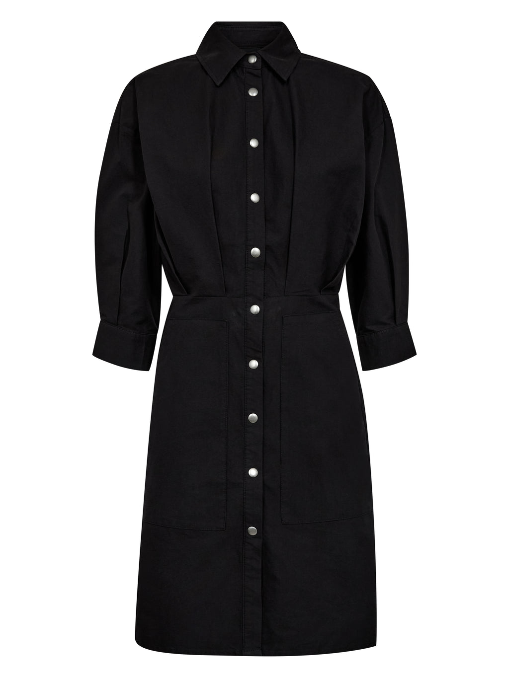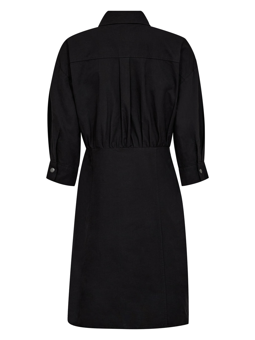 This shirt dress has a simple and feminine look with a classic collar and button closure all the way down. The waist is lightly defined, giving the dress shape, while the 3/4-length sleeves with cuffs add a relaxed touch. The front and back are kept clean, focusing on fit and cut. The dress is easy to wear both alone and layered depending on the occasion.