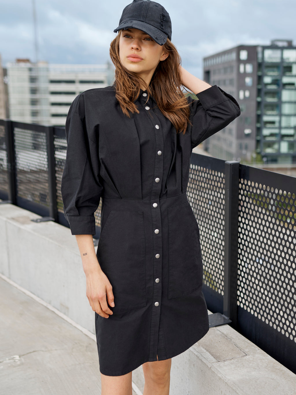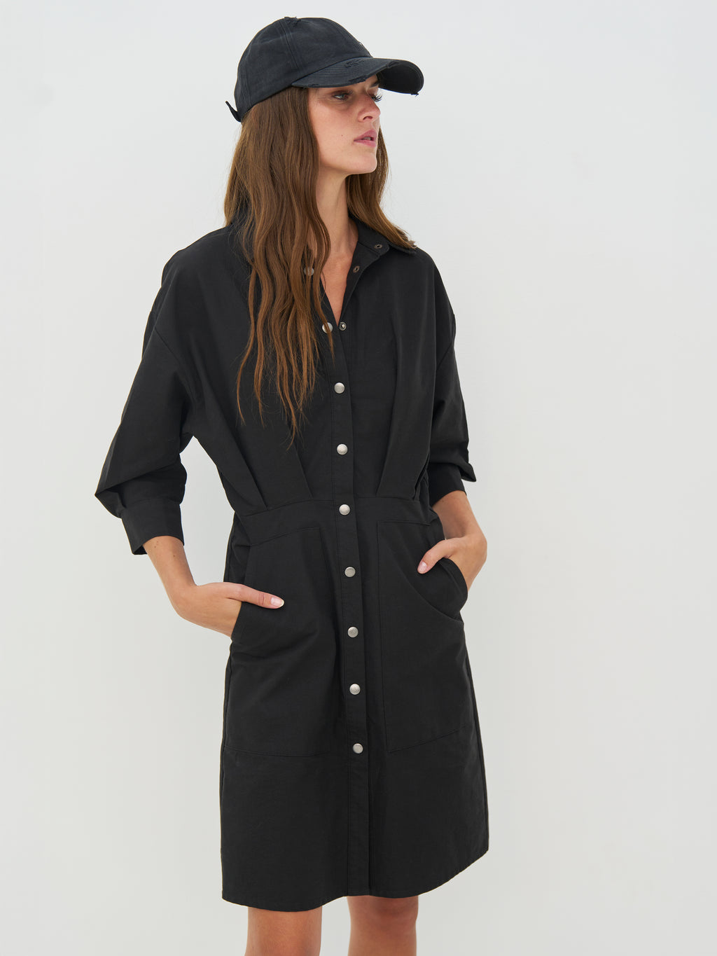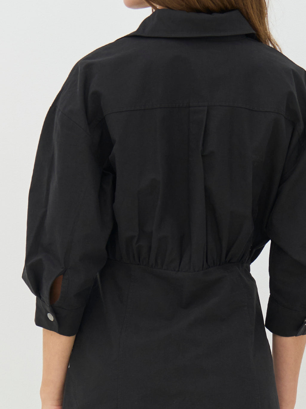 This shirt dress has a simple and feminine look with a classic collar and button closure all the way down. The waist is lightly defined, giving the dress shape, while the 3/4-length sleeves with cuffs add a relaxed touch. The front and back are kept clean, focusing on fit and cut. The dress is easy to wear both alone and layered depending on the occasion.