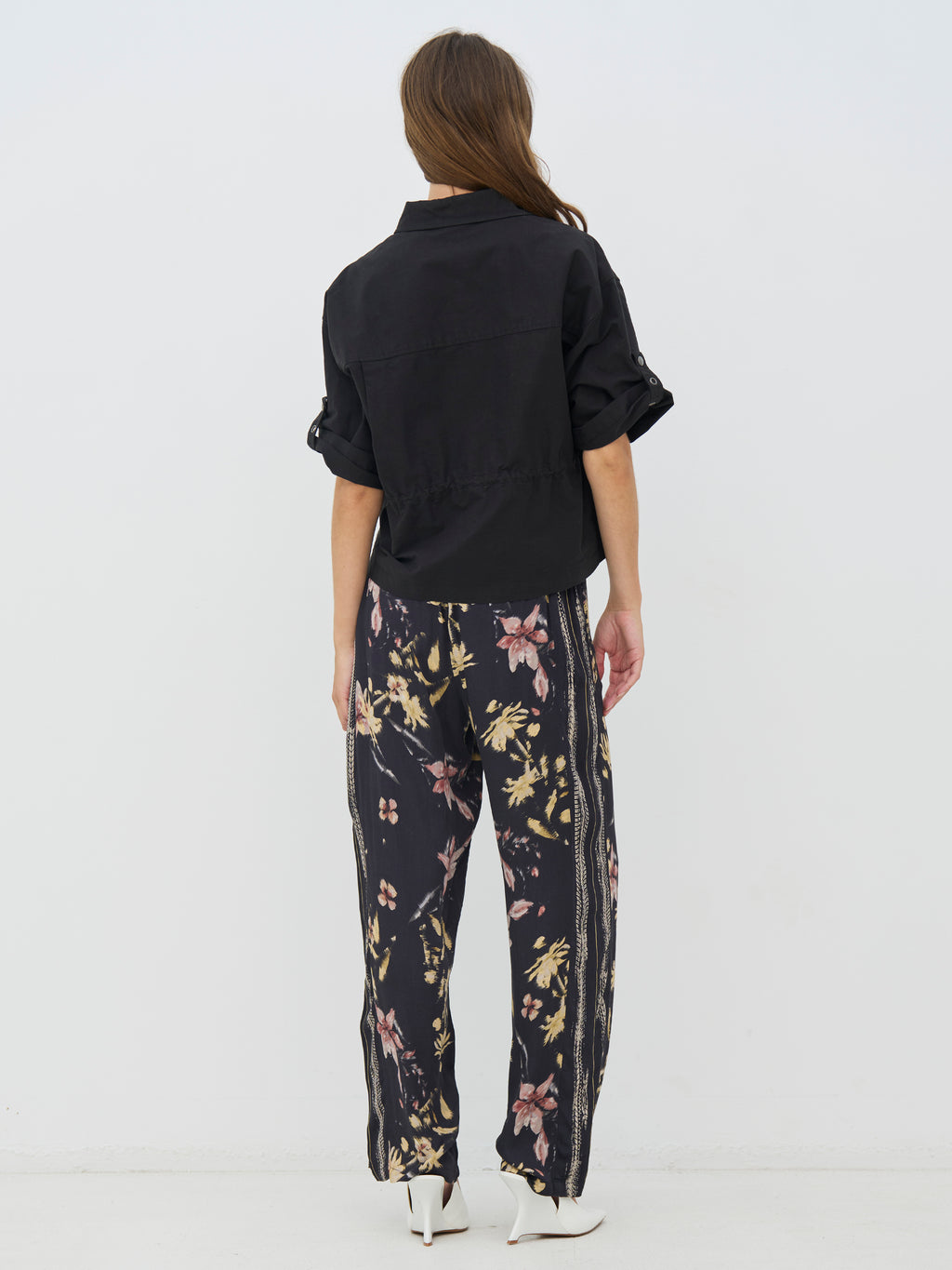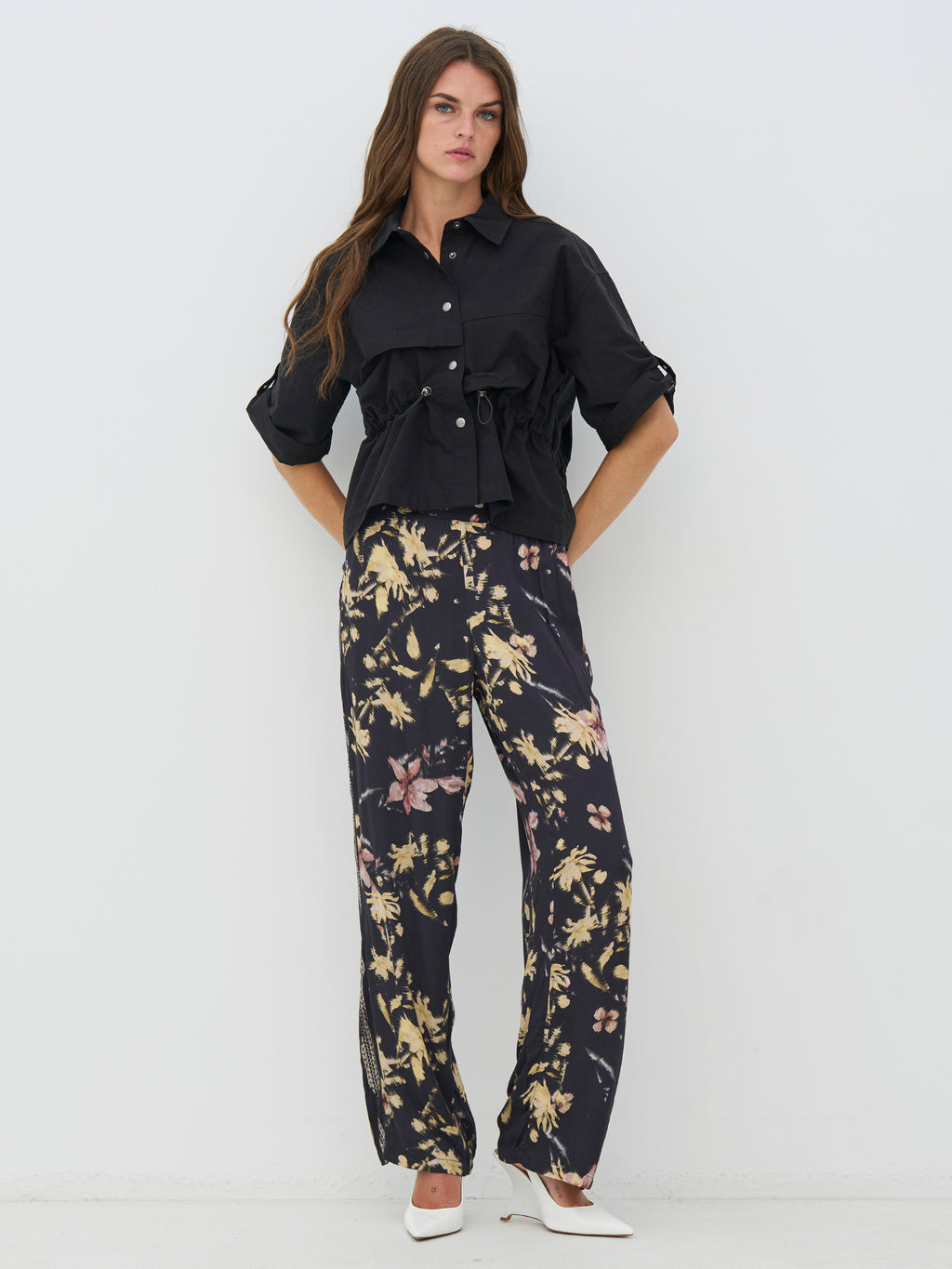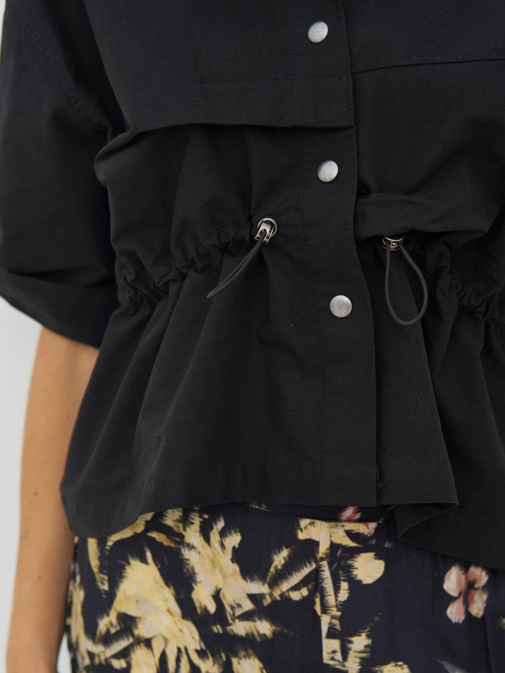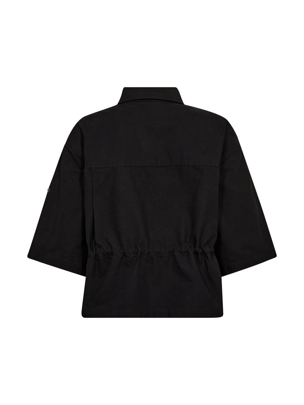 This black shirt has a complete and functional look with short sleeves and a classic collar. It closes at the front with snap buttons, and the adjustable drawstring at the waist allows you to shape the fit as needed. The light wrinkles add an edge, while the back is kept simpler and drapes nicely. The shirt works both closed and open and is easy to style with both pants and skirts.
