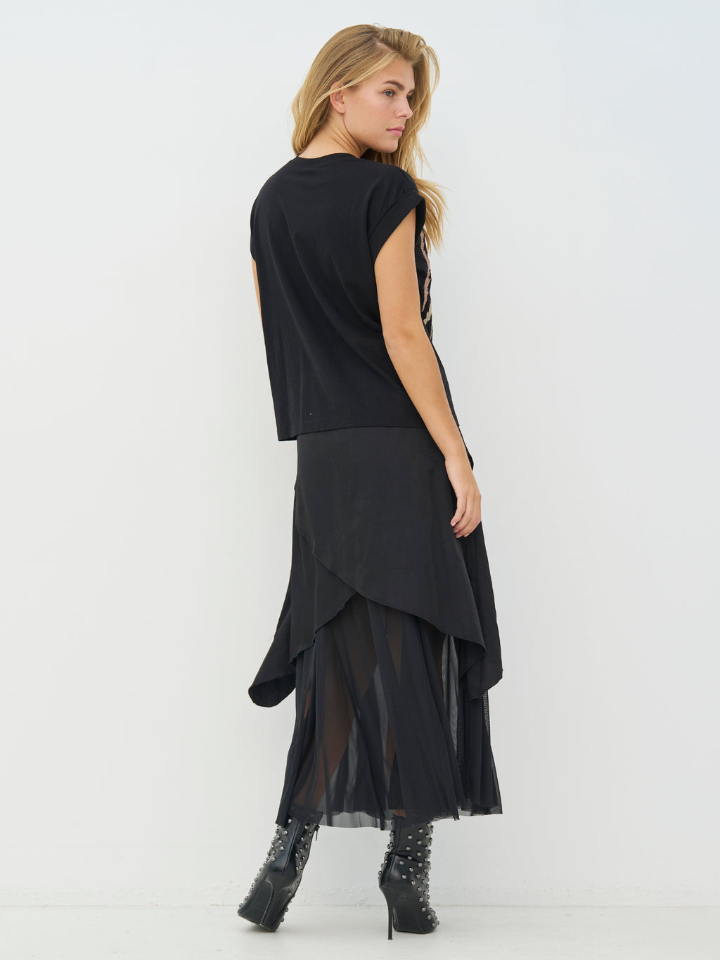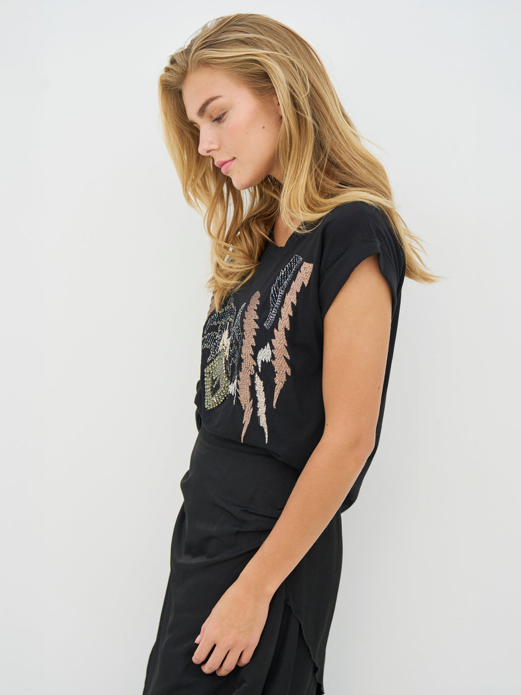 This T-shirt has a simple cut with short sleeves and a round neck, but gets its special expression from the detailed embroideries and sewn-on beads on the front. The combination of embroidery and beads creates depth and provides a decorative focus without becoming too heavy. The back is completely simple and balances the look nicely. Style the T-shirt with jeans, loose pants, or under an open blazer when the outfit could use some extra character.