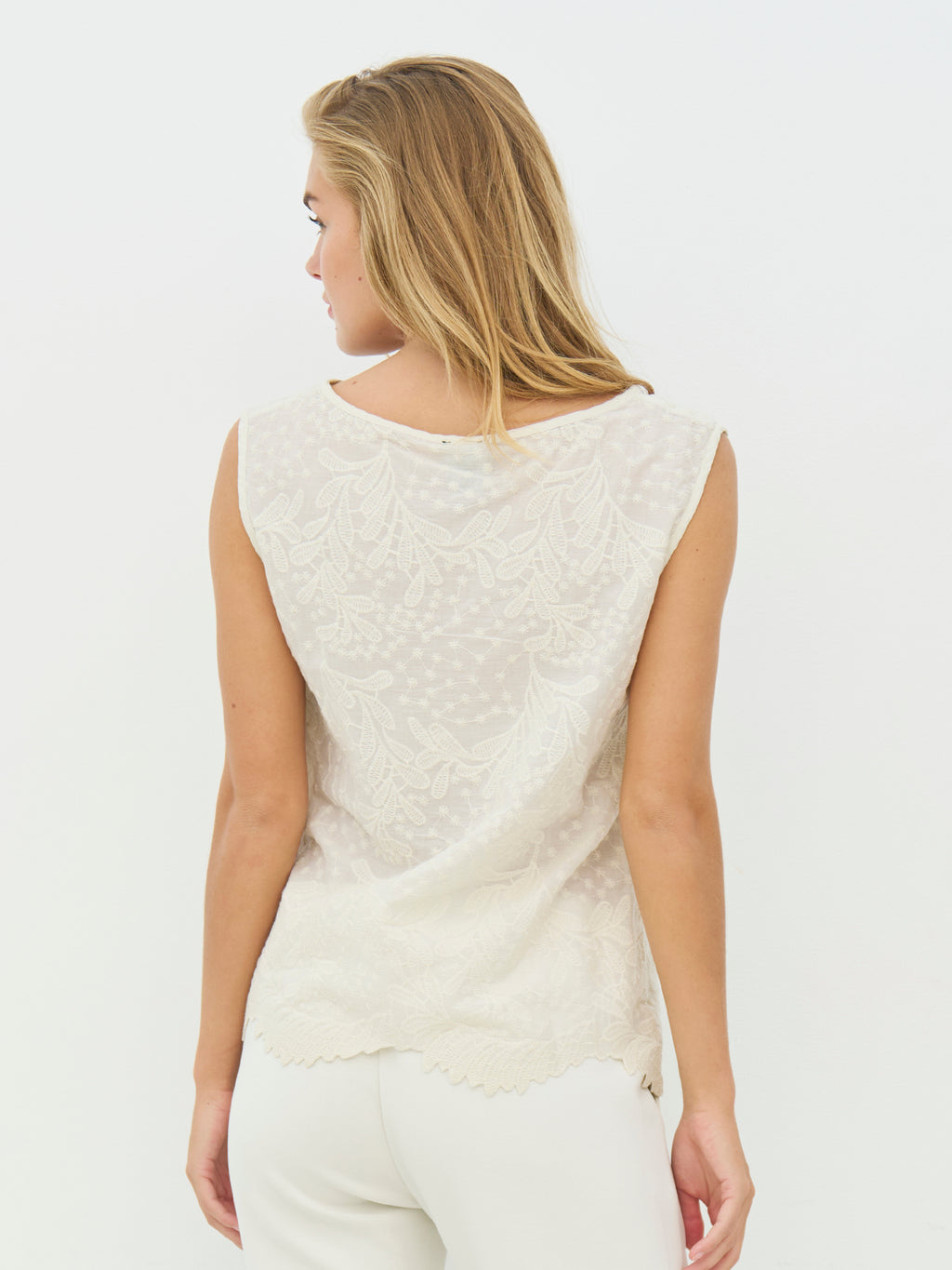 This top has a simple and feminine expression with a light, straight fit. The sleeveless cut provides a clean look, while the bottom edge adds a discreet play to the silhouette. The top falls softly along the body and is easy to style both alone or together with the matching pieces for a coordinated look.