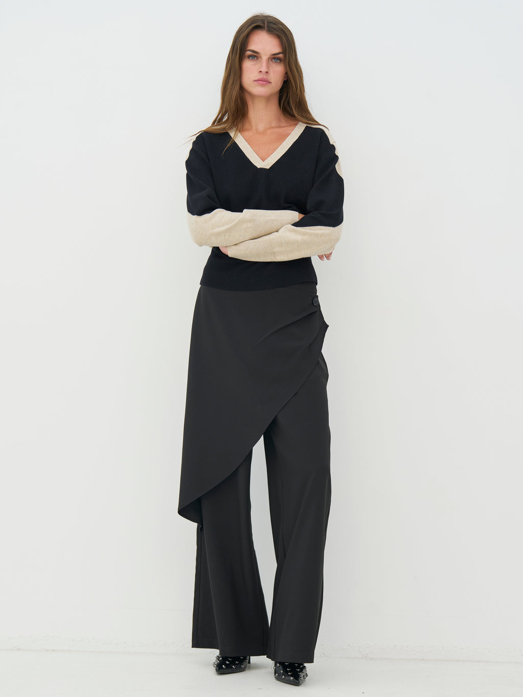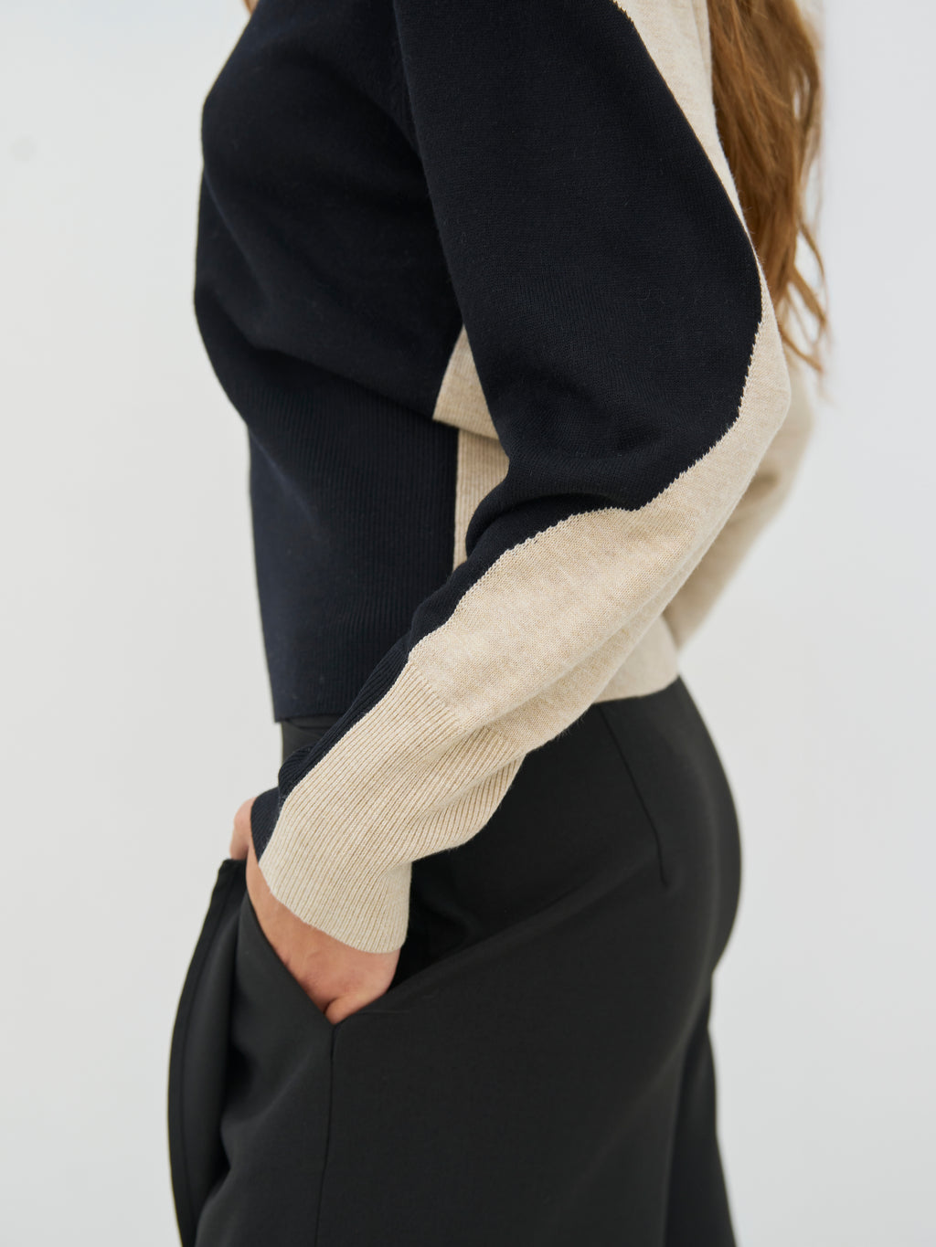 This knitted blouse has a simple yet striking expression with contrast panels that give the design a graphic playfulness. The blouse features a classic V-neckline, while the back is more subdued, creating balance in the overall look. The long sleeves follow the same contrast details, providing a cohesive appearance from all angles. Style the blouse with a pair of classic trousers or a skirt for a casual, yet thoughtful everyday outfit.