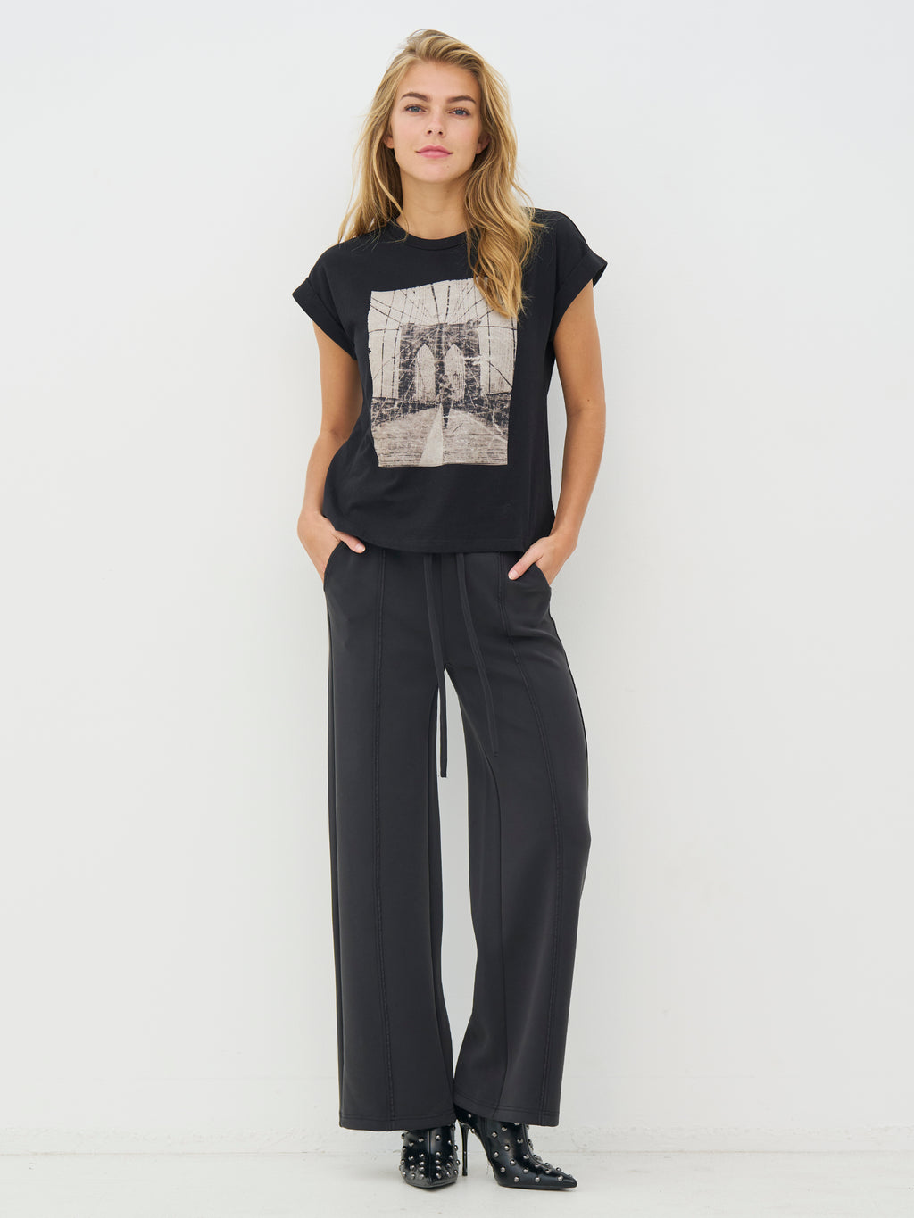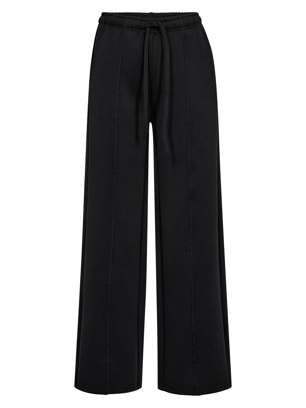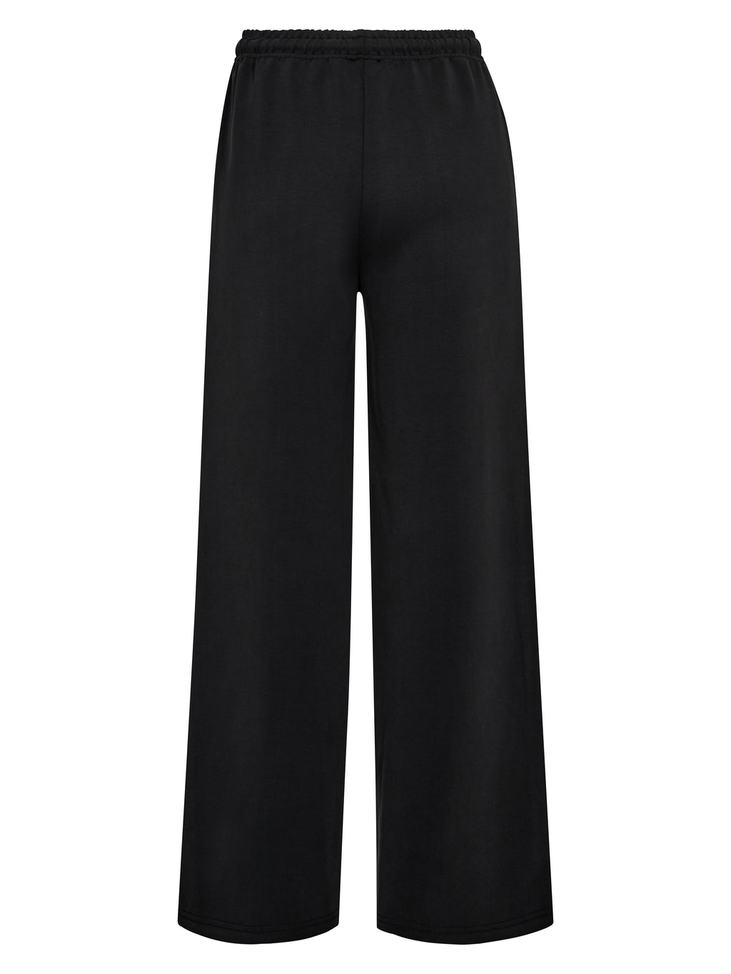 These trousers have a relaxed fit with straight, wide legs and an elastic waistband with a drawstring, making them easy to adjust. Along the legs runs a discreet band with a subtle 3D effect, adding depth and a nice touch to an otherwise calm appearance. The front is simple with vertical seam details, while the back is completely plain. The trousers are very stretchy and soft, making them comfortable to wear all day. Style them with the matching jacket for a complete set, or with a blouse or shirt for a casual everyday look.