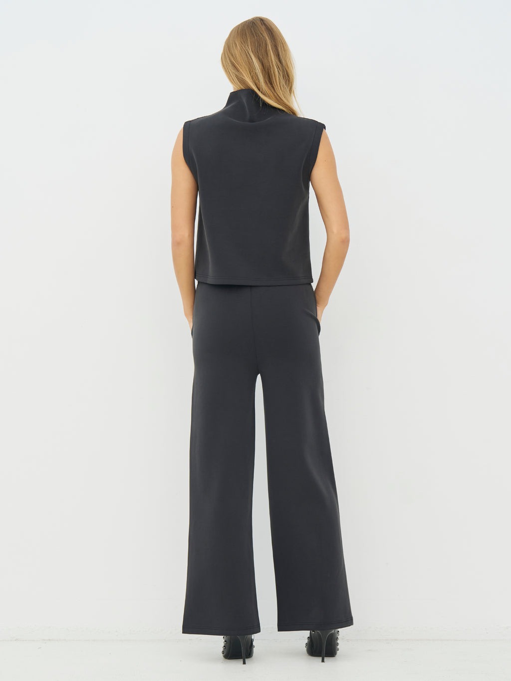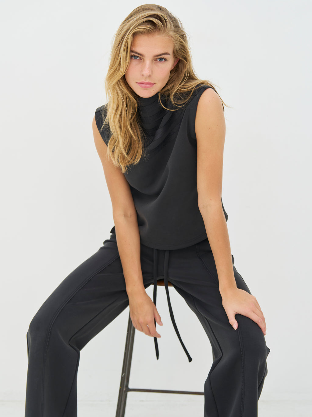 This top has a simple expression with a straight fit and high neckline. The front is calm, while the subtle band details at the shoulder add some structure and a graphic twist. The back is completely plain and keeps the expression clean. Style the top with the jacket and pants from the Cyra series for a cool, coordinated set, or pair it with trousers or shorts for a casual but neat everyday look.
