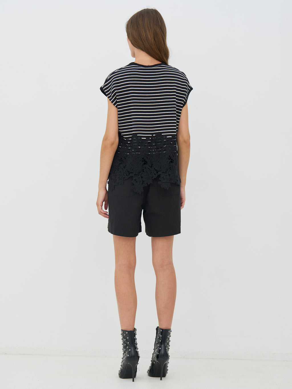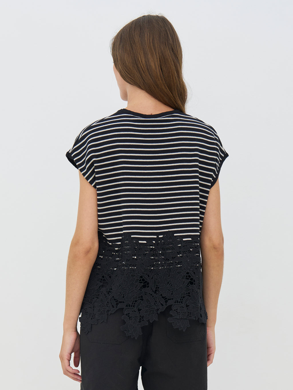 This knitted T-shirt combines a relaxed fit with fine details. The classic stripes create a calm expression, while the decorative lace edge at the bottom adds contrast and a bit of edge. The fit is straight with short sleeves, making it easy to style with both pants and skirts. A good balance between simplicity and a more feminine look - perfect for both everyday wear and more styled looks.