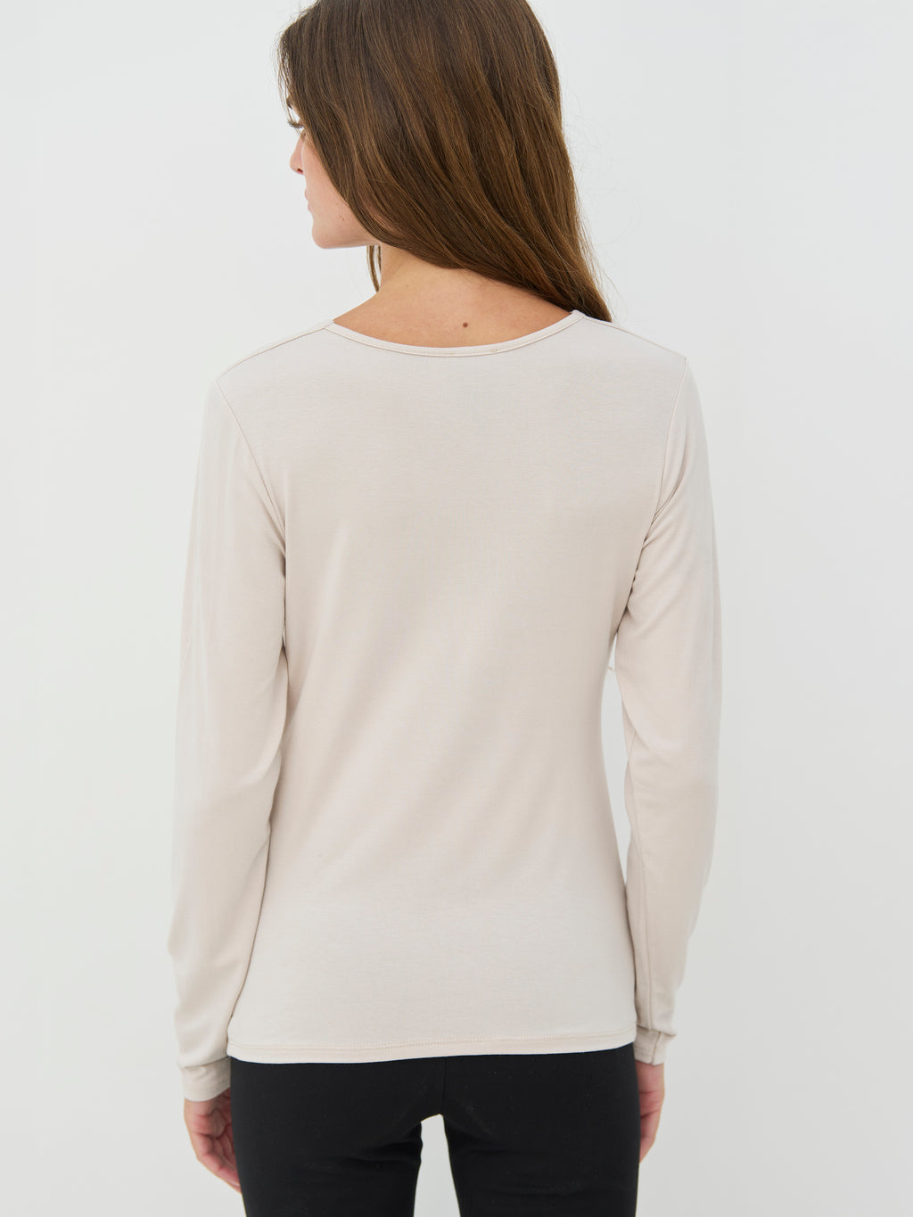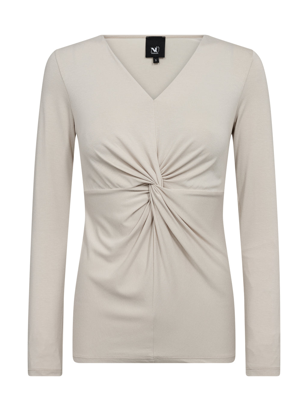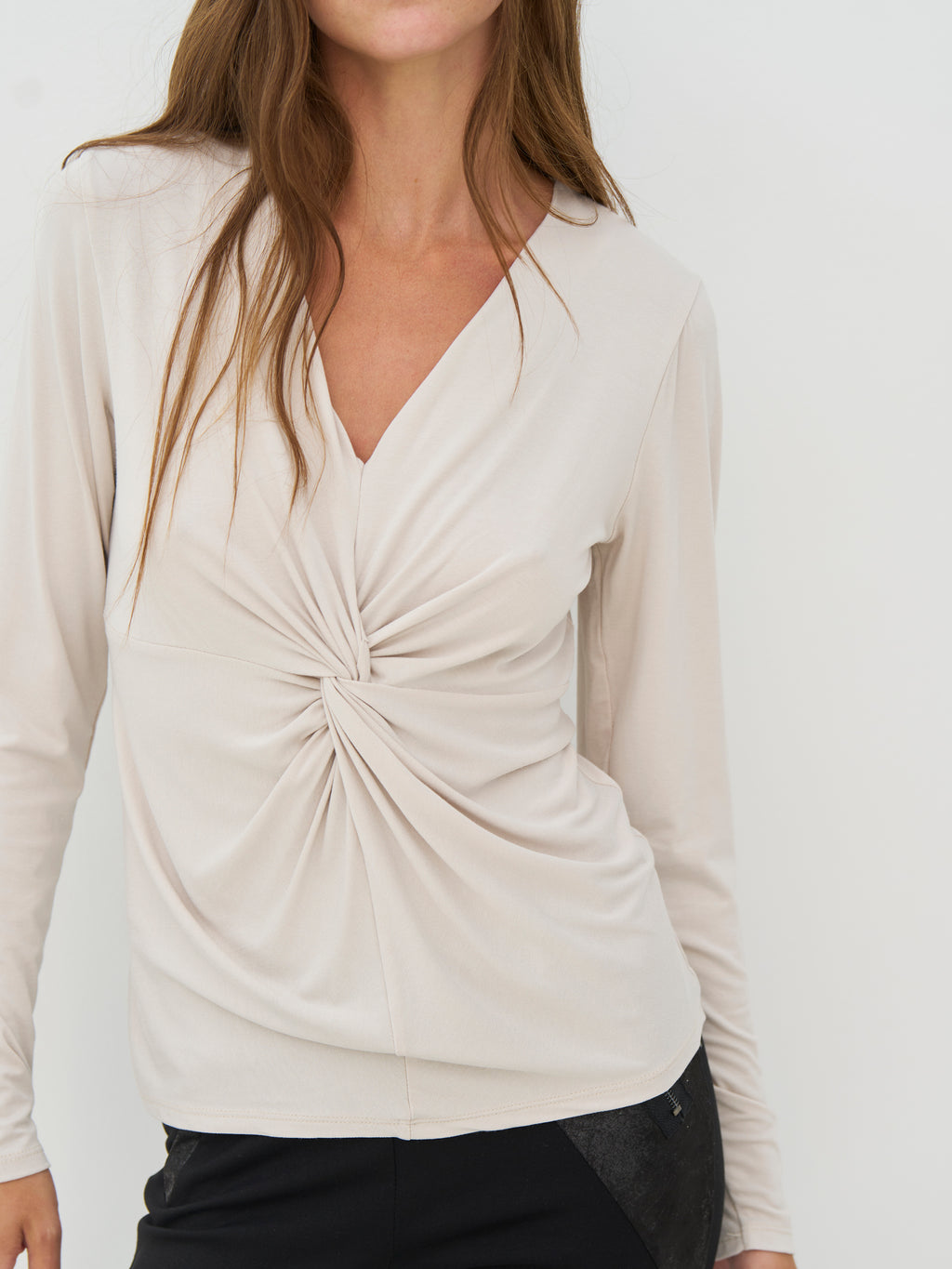 This blouse has a feminine and simple expression with long sleeves and a flattering V-neckline. The front is gathered in a decorative knot at the waist, creating a soft drape and giving a nice shape to the silhouette, while the back is more simple and smooth in appearance. The blouse falls nicely on the body without looking tight. Style it with pants or a skirt for a perfect everyday look, and add a jacket for a more complete outfit.
