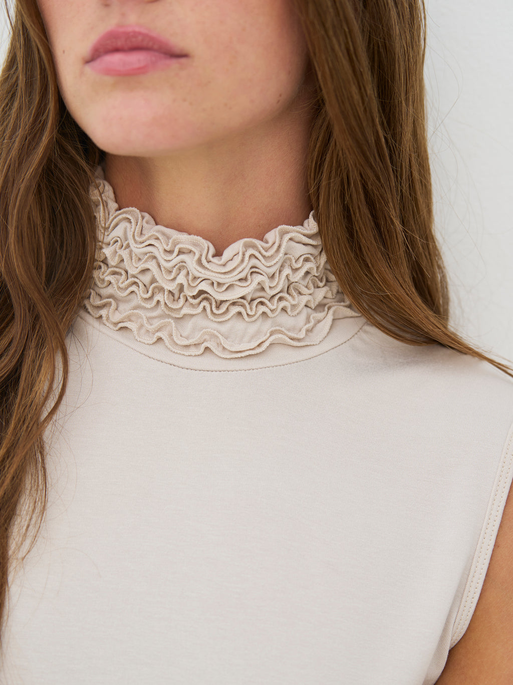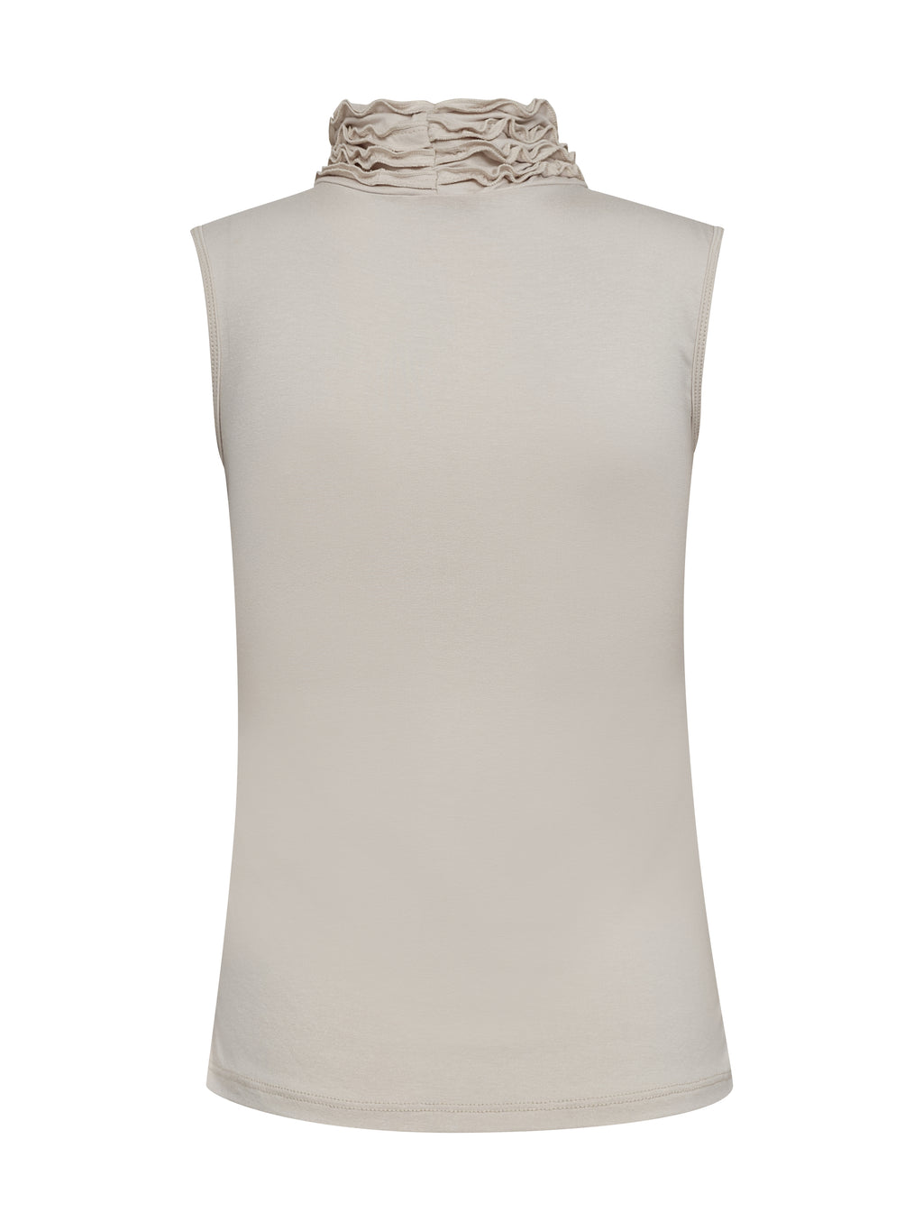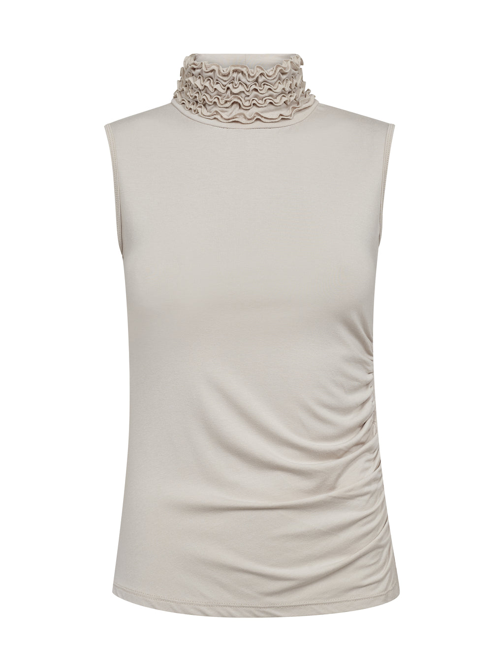 This top has a simple and feminine look with a close-fitting silhouette and a high neck finished with delicate, soft ruffle details. The front is smooth and calm, while the side is gathered with light ruching, providing shape and movement. Style the top under a jacket or cardigan, or wear it alone with pants, shorts, or a skirt for an elegant everyday look.