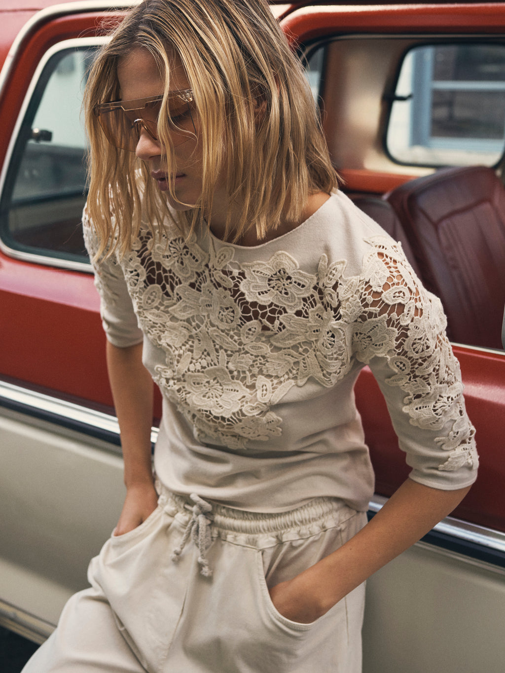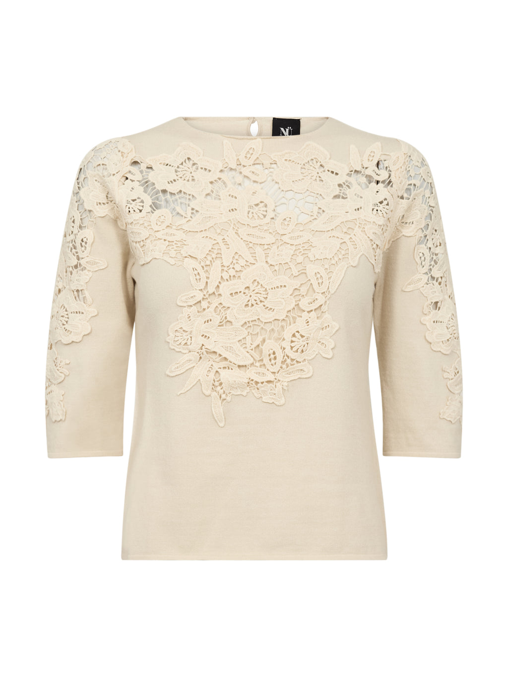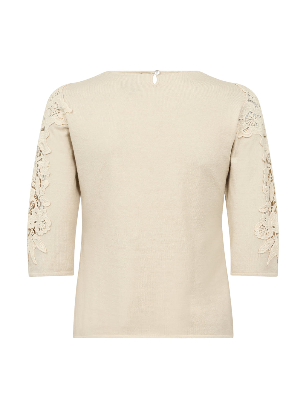 This blouse is made of a soft viscose blend with EcoVero™, which provides a comfortable and light quality. It features a classic fit with 3/4 sleeves and a round neck, making it easy to wear for both everyday and more formal occasions. The delicate lace details on the front and sleeves add a feminine and elegant look.