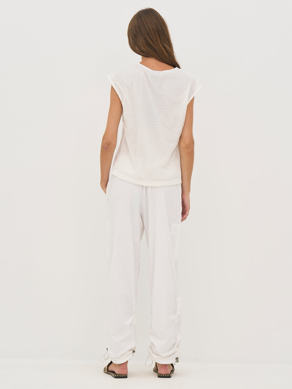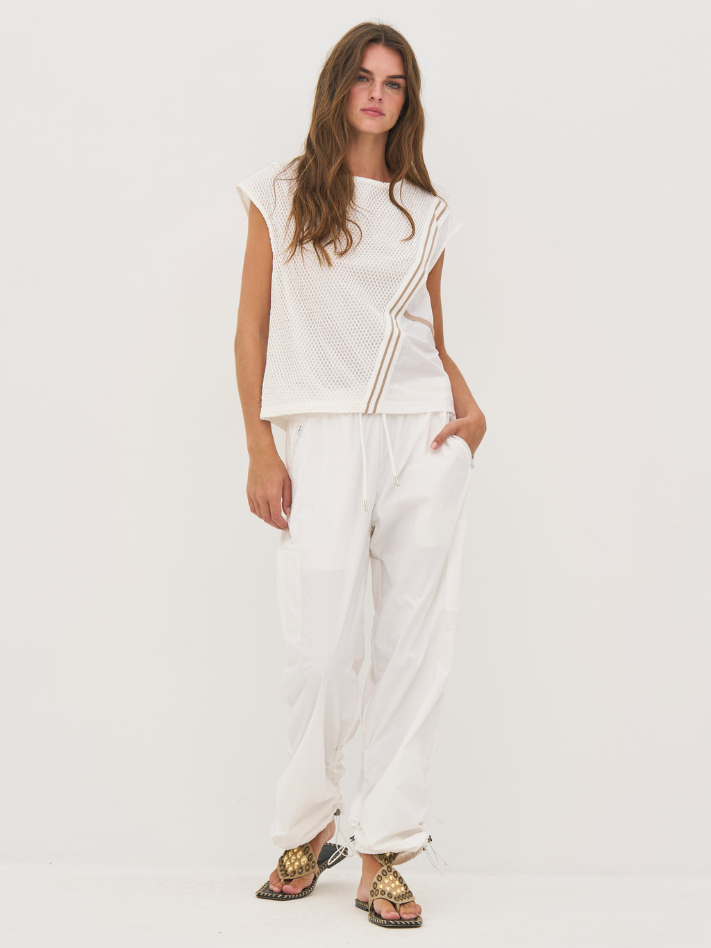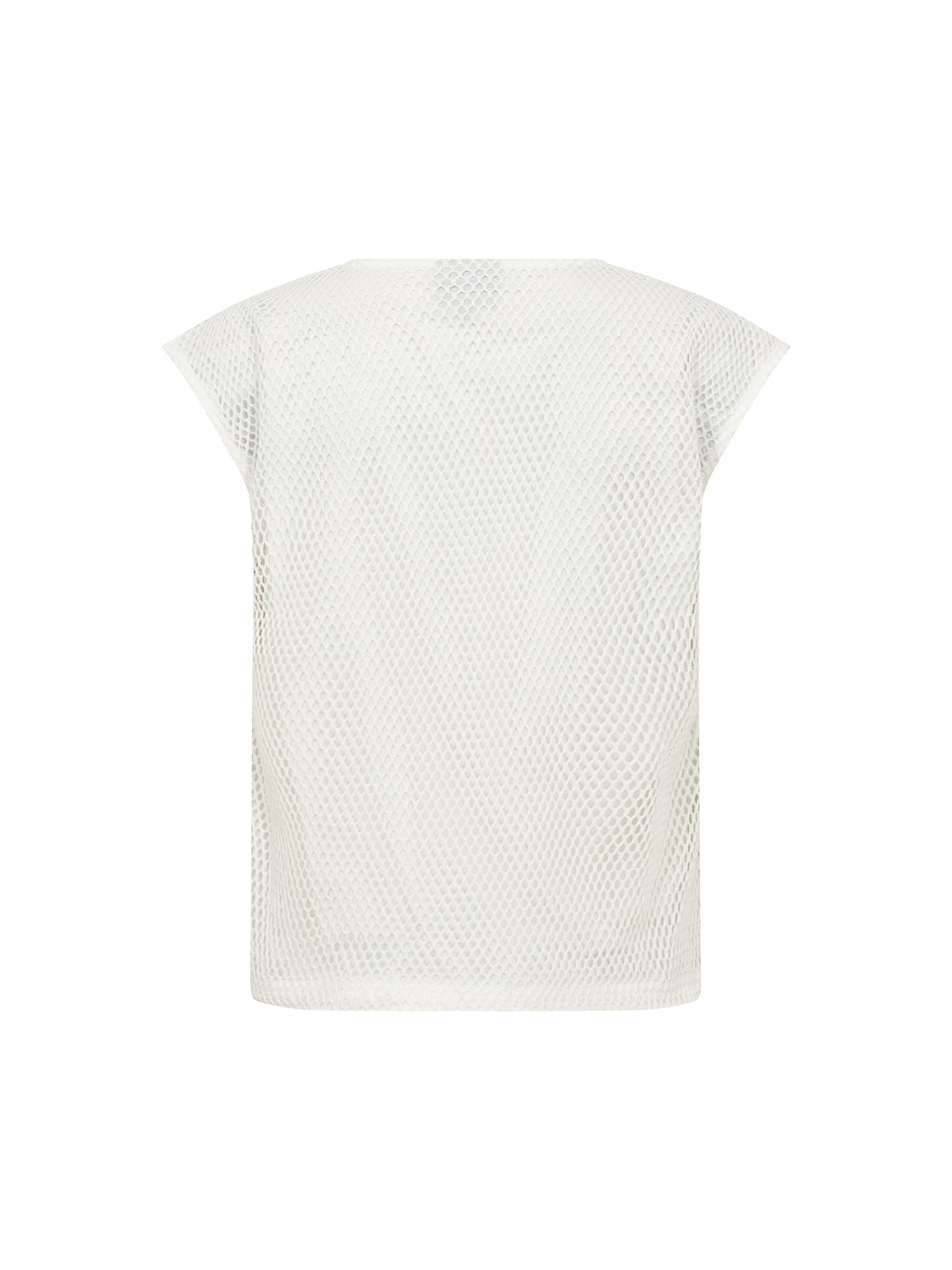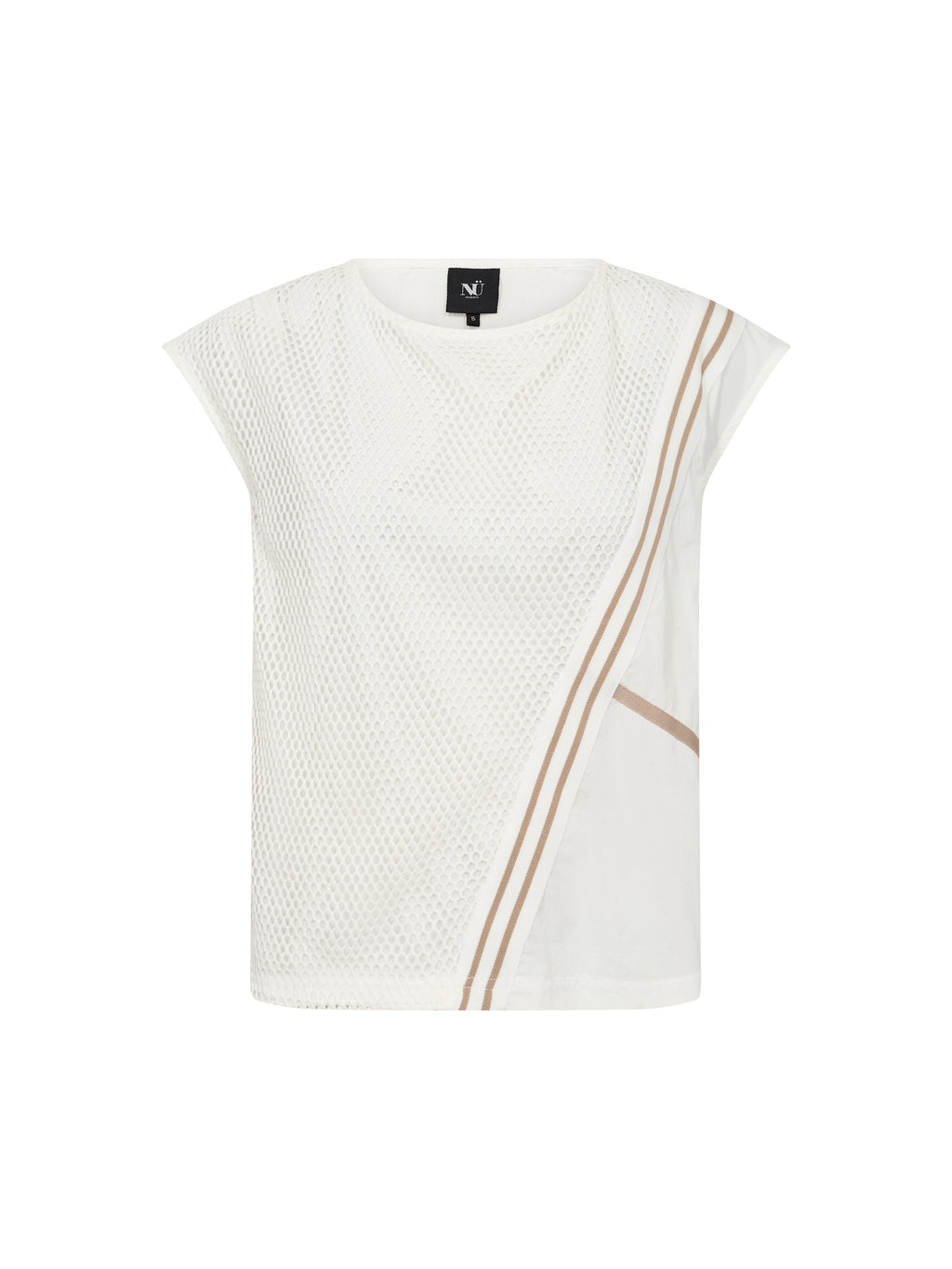 This top has a light and airy look with a structured quality that gives a sporty touch. It is designed with inner lining, ensuring a covered look while maintaining the open expression. The diagonal stripes add a dynamic detail, while the relaxed fit provides an effortless silhouette. At the back, the design continues with the same layered effect.