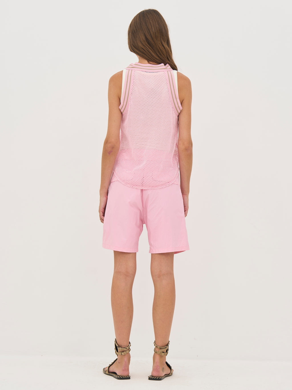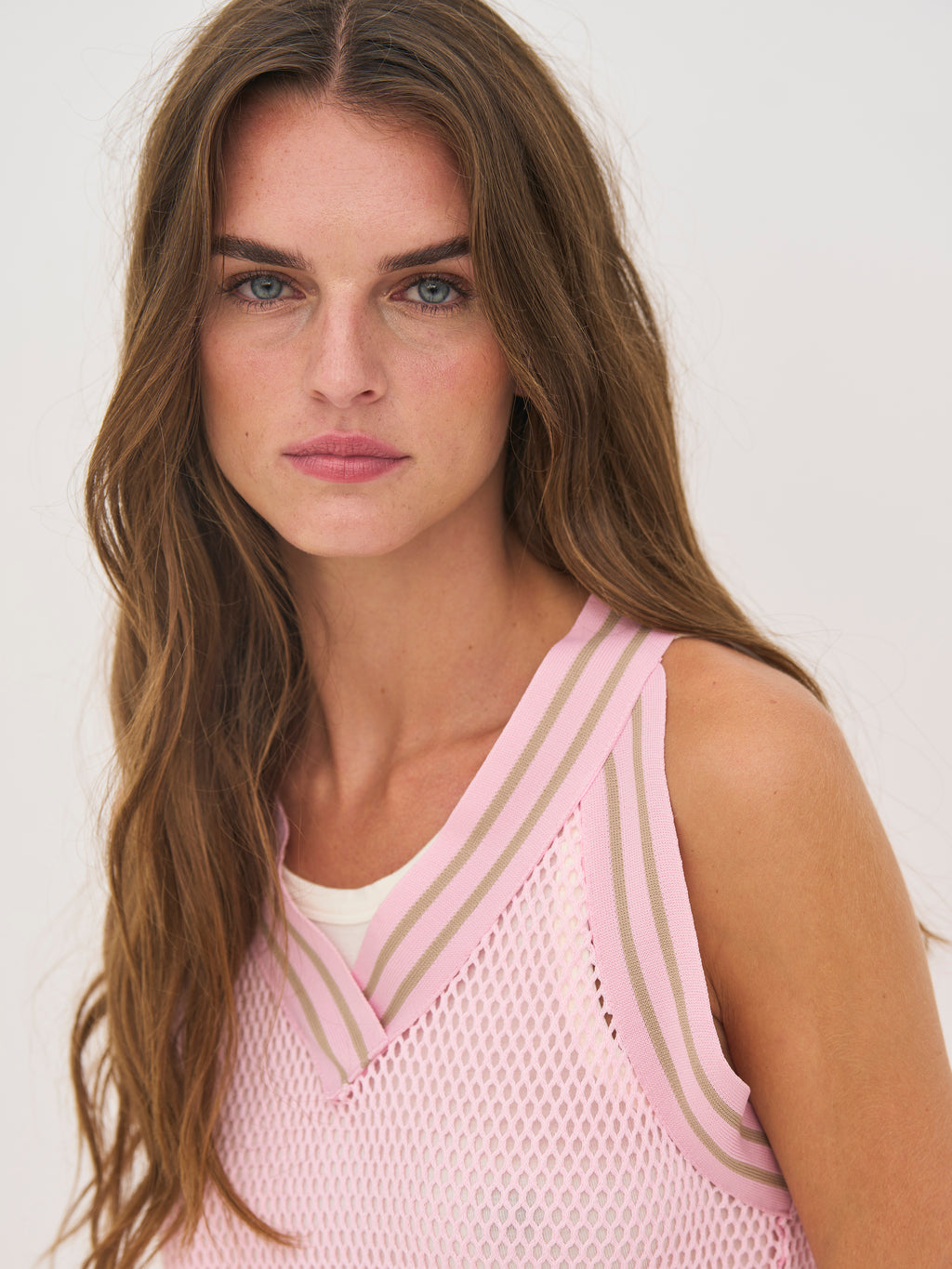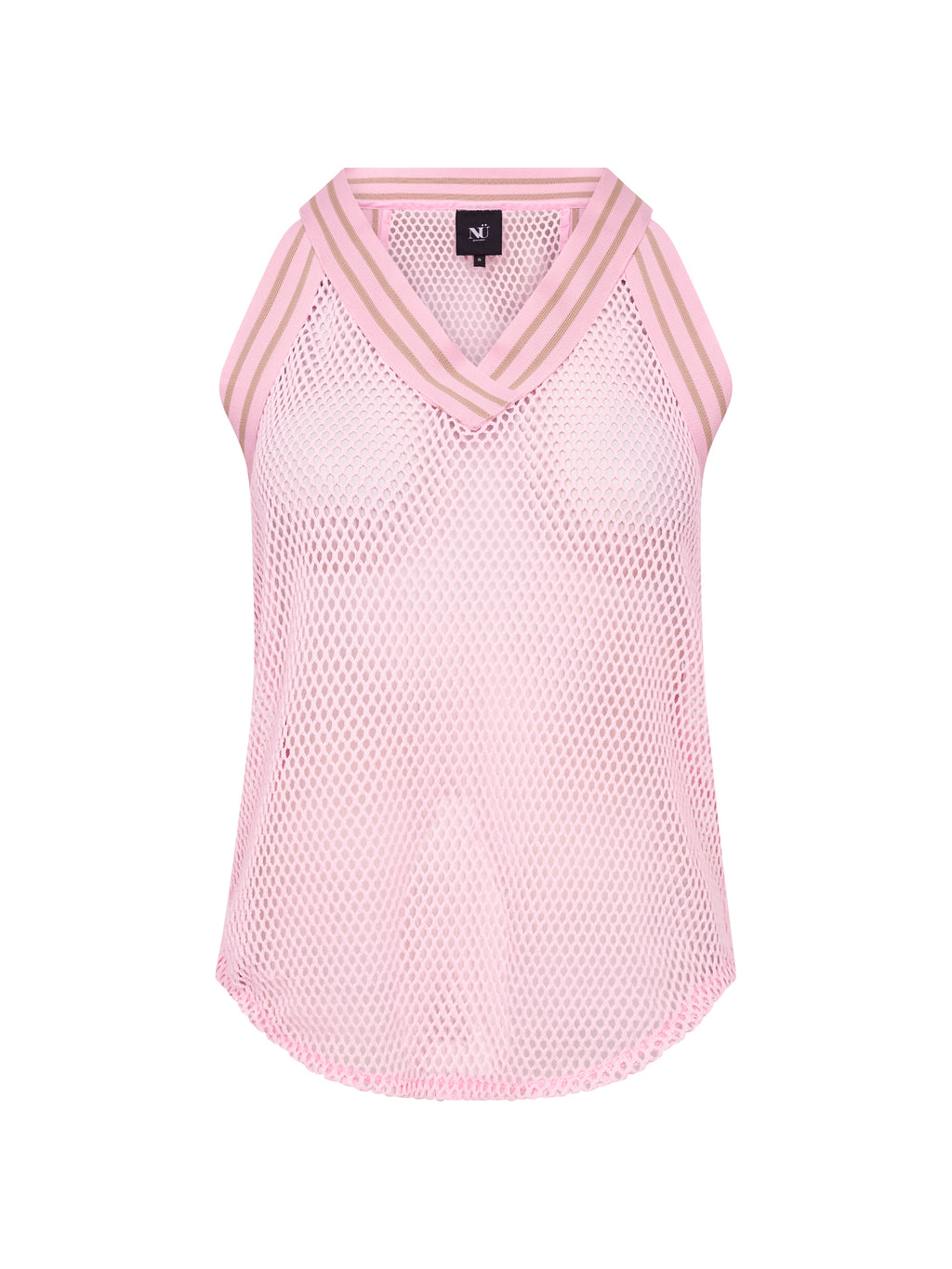 This top has a light and airy look with a structured quality that makes it ideal for layering. It is designed with a sporty V-neckline with an elastic edge, adding a modern touch. The sleeveless silhouette provides a relaxed look, while the rounded bottom edge creates a soft drape.