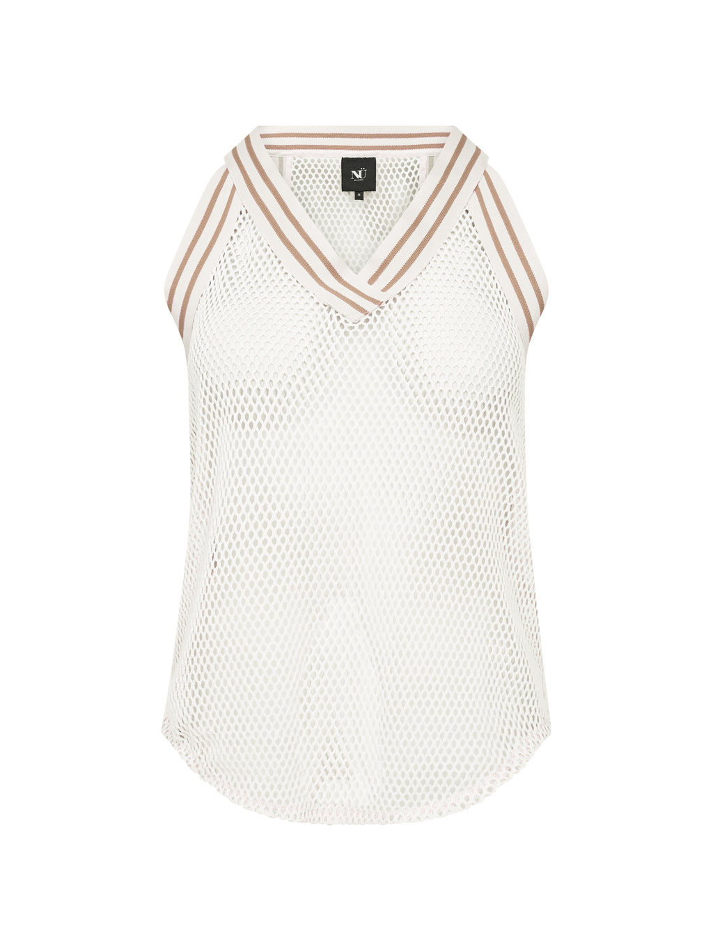 This top has a light and airy look with a structured quality that makes it ideal for layering. It is designed with a sporty V-neckline with an elastic edge, adding a modern touch. The sleeveless silhouette provides a relaxed look, while the rounded bottom edge creates a soft drape.