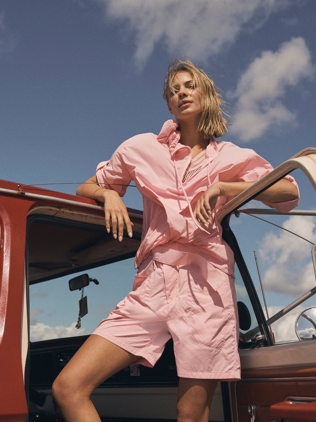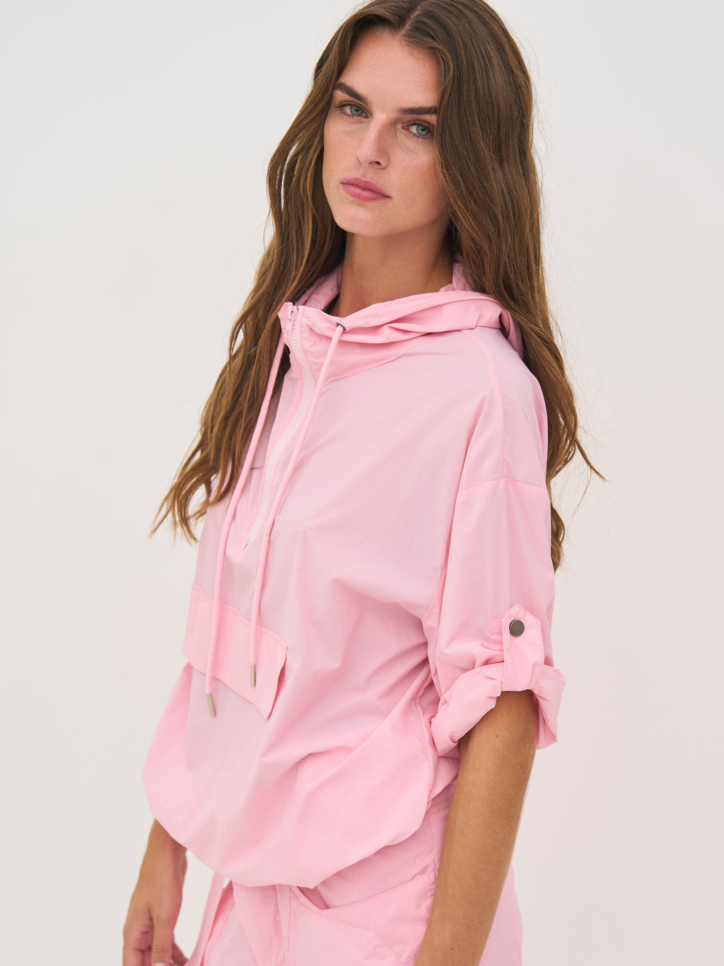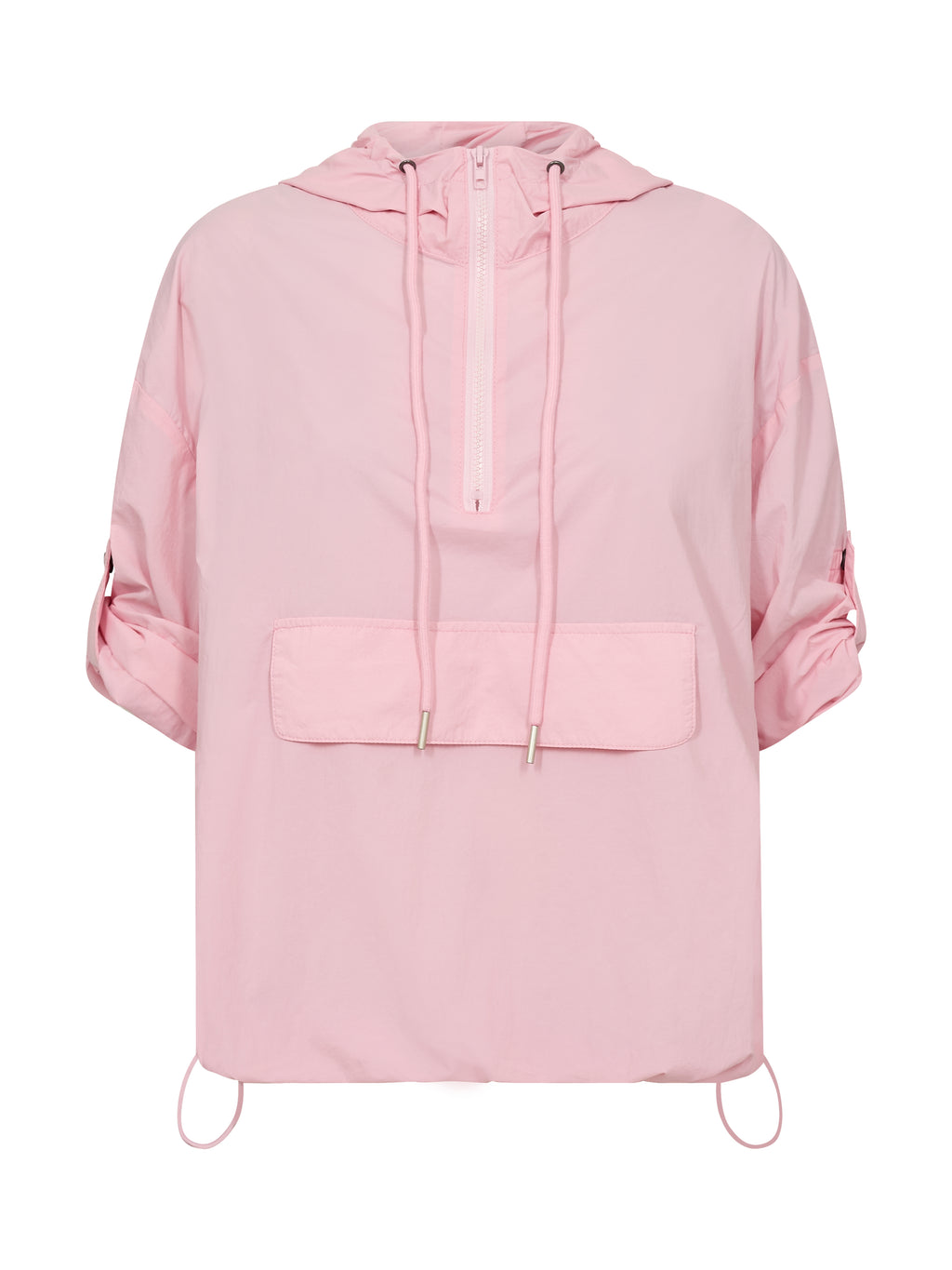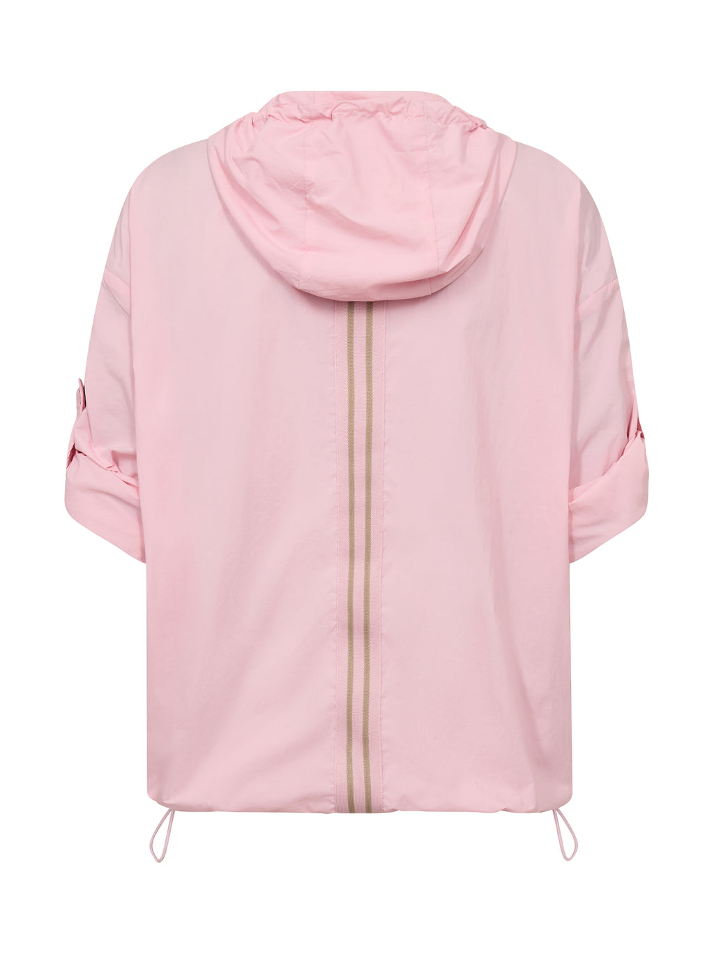 This blouse has a light and airy expression, making it ideal for layering during transitional periods. It is designed with a half zip and hood with drawstring, adding a sporty and functional touch. The sleeves can be adjusted and fastened with a loop and snap button, providing flexibility in the look. The elastic cord at the bottom allows for adjusting the fit, while the striped detail at the back adds a subtle contrast.