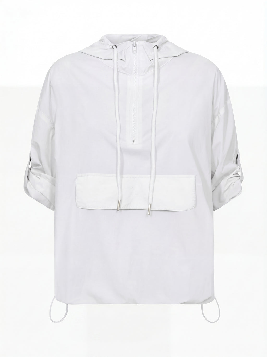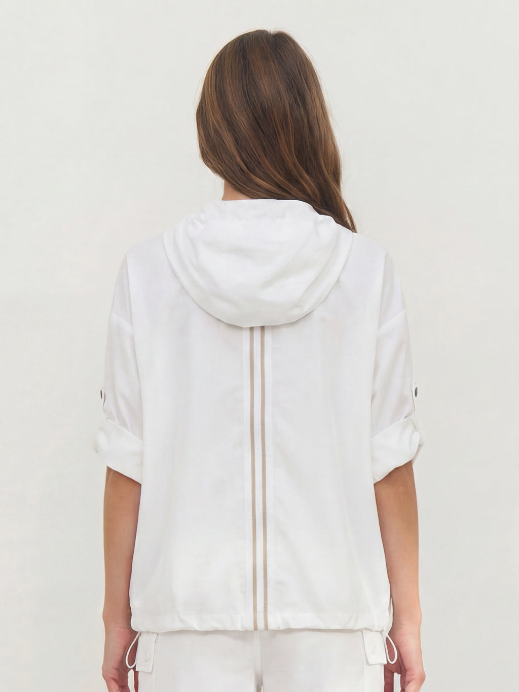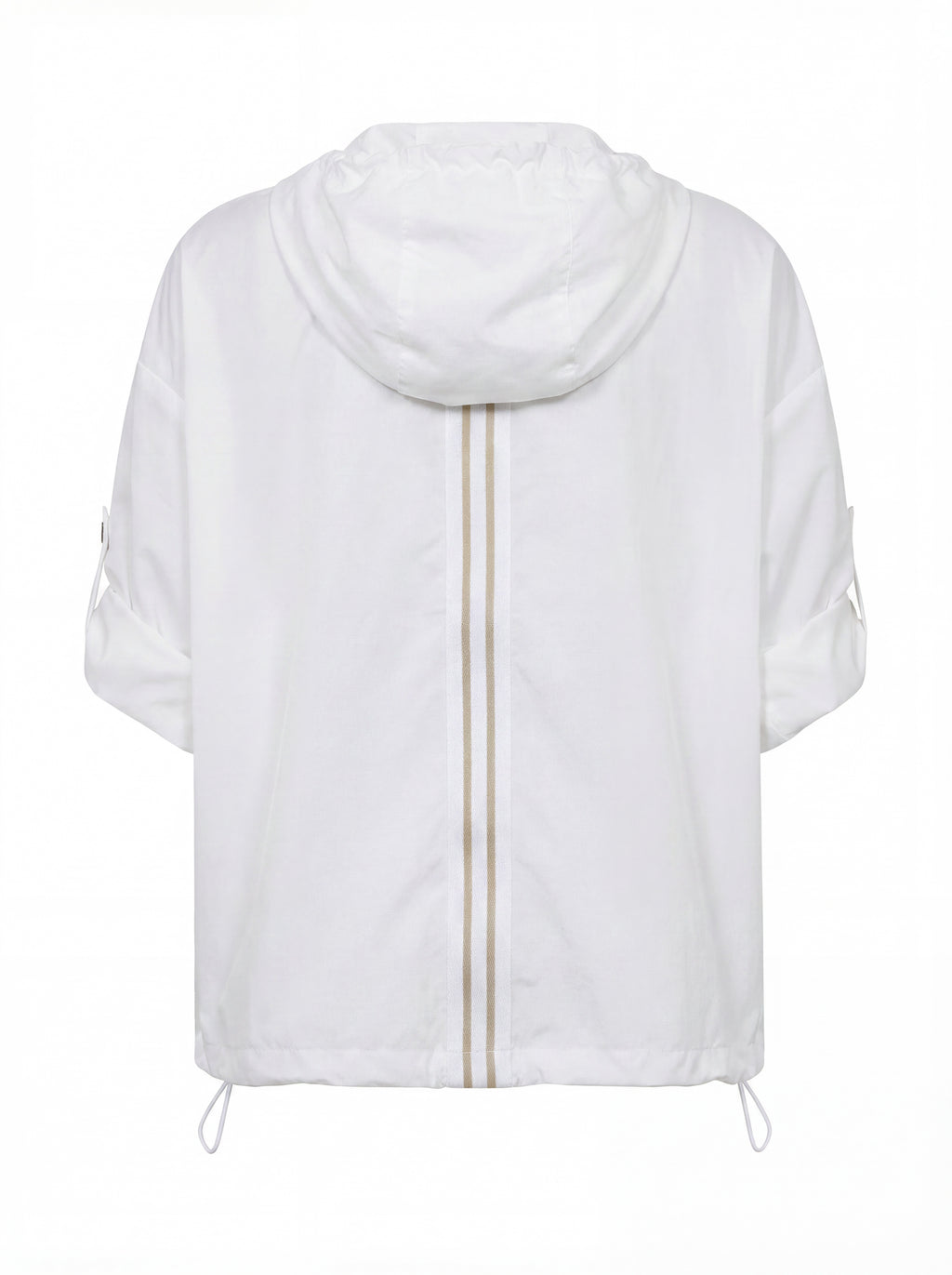 This blouse has a light and airy expression, making it ideal for layering during transitional periods. It is designed with a half zip and hood with drawstring, adding a sporty and functional touch. The sleeves can be adjusted and fastened with a loop and snap button, providing flexibility in the look. The elastic cord at the bottom allows for adjusting the fit, while the striped detail at the back adds a subtle contrast.