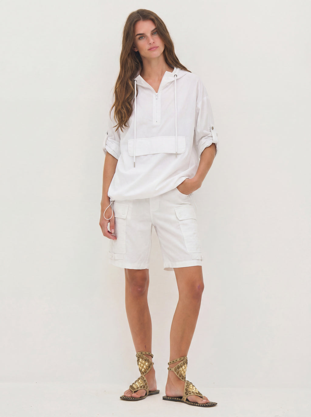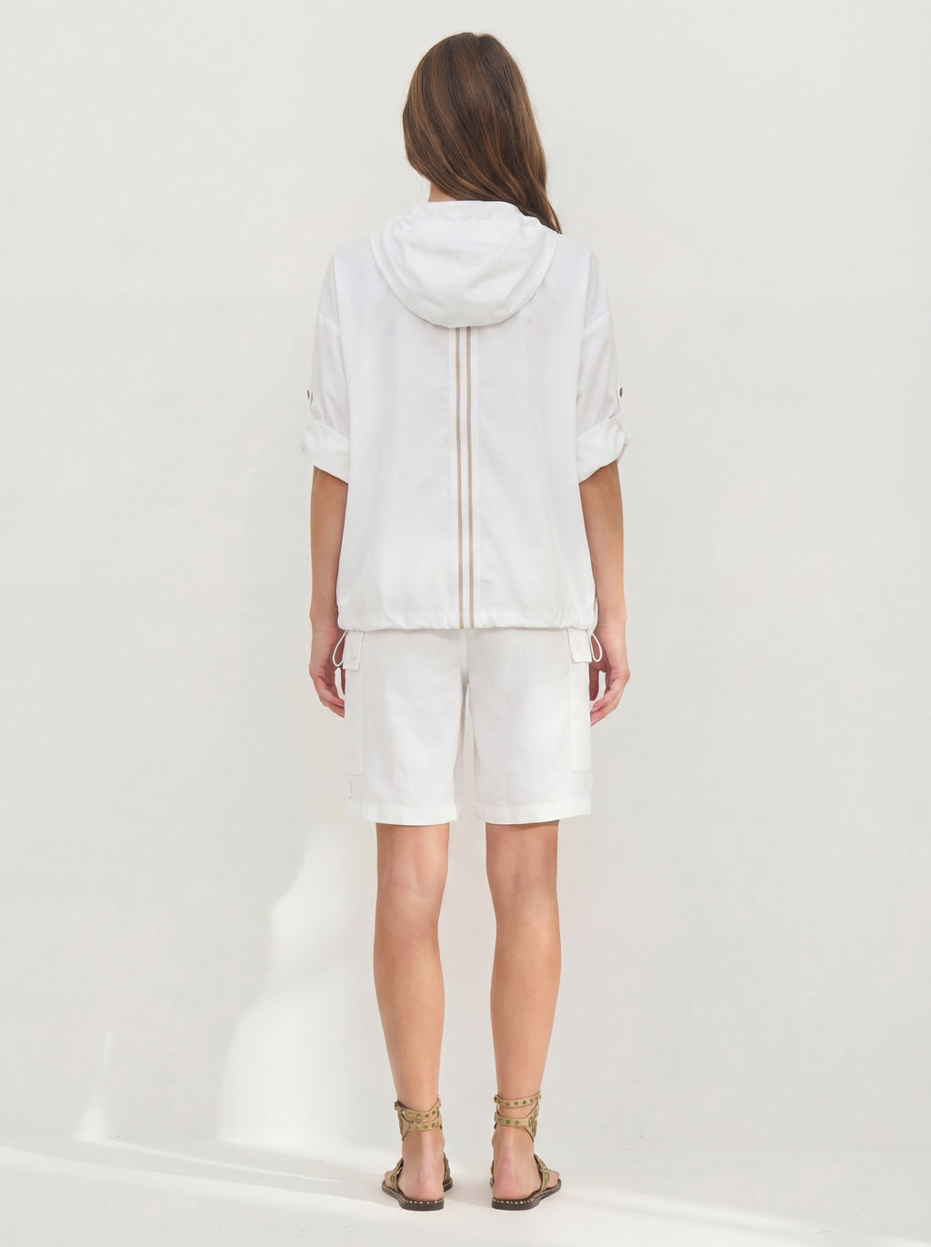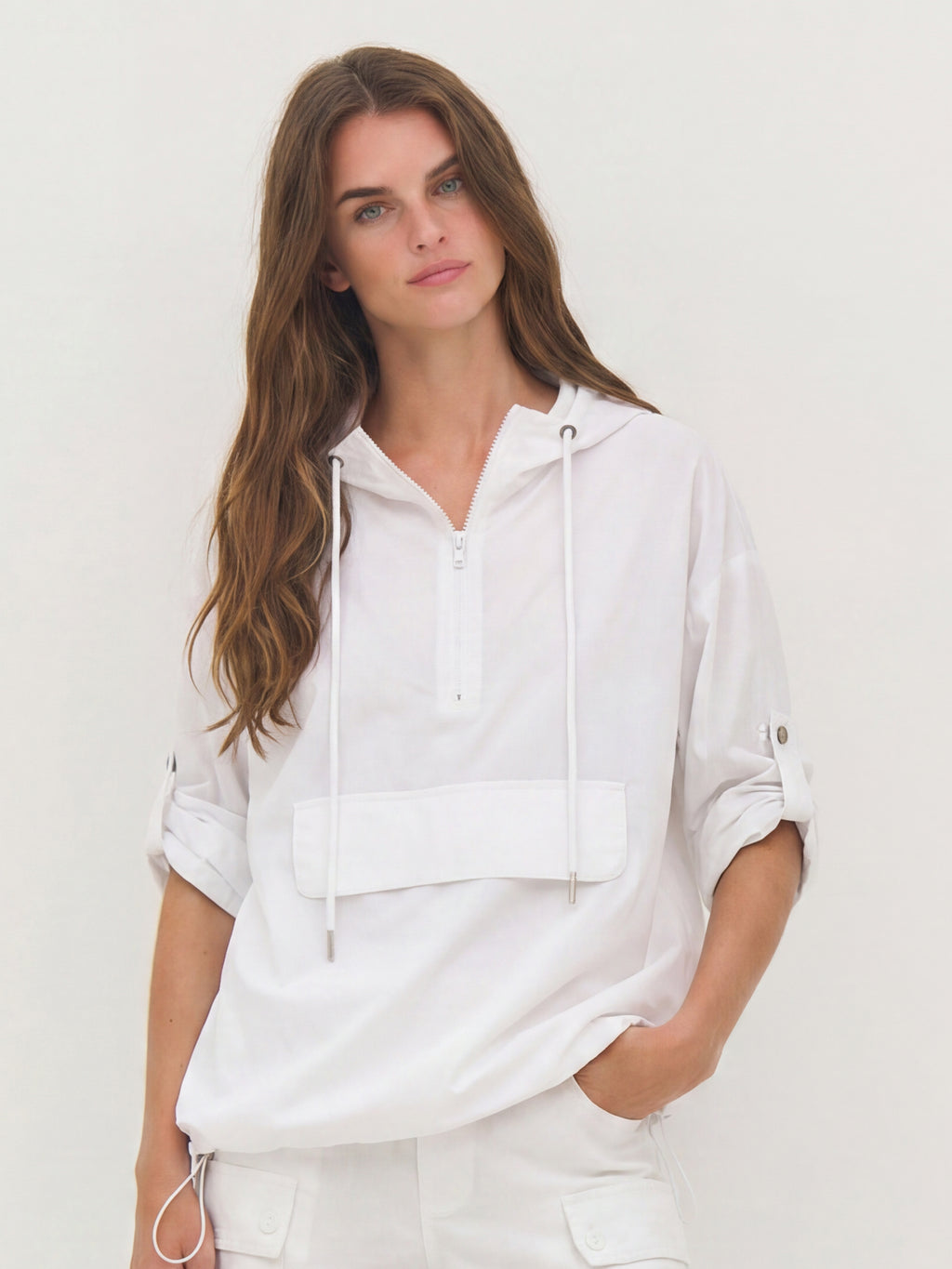 This blouse has a light and airy expression, making it ideal for layering during transitional periods. It is designed with a half zip and hood with drawstring, adding a sporty and functional touch. The sleeves can be adjusted and fastened with a loop and snap button, providing flexibility in the look. The elastic cord at the bottom allows for adjusting the fit, while the striped detail at the back adds a subtle contrast.