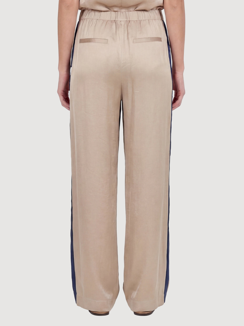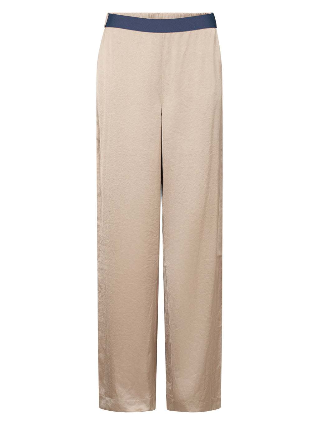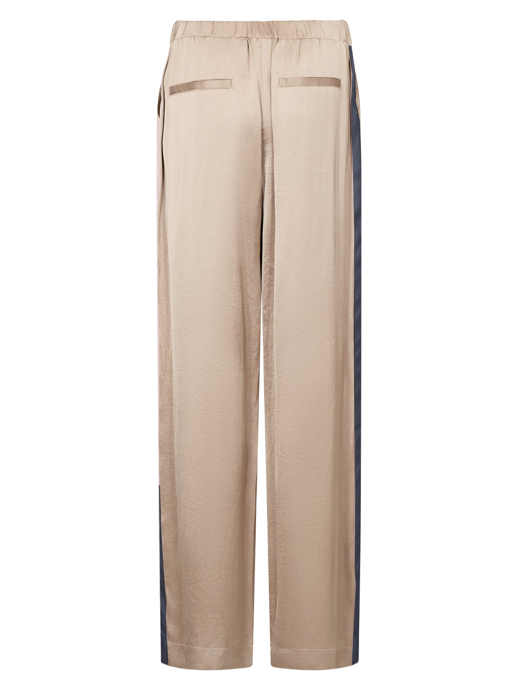 These trousers are made from a lightweight viscose blend with a subtle sheen, creating an elegant and flowing drape. They feature long, straight legs and a simple silhouette, while the contrast detail at the waist and along the sides adds a modern twist.
