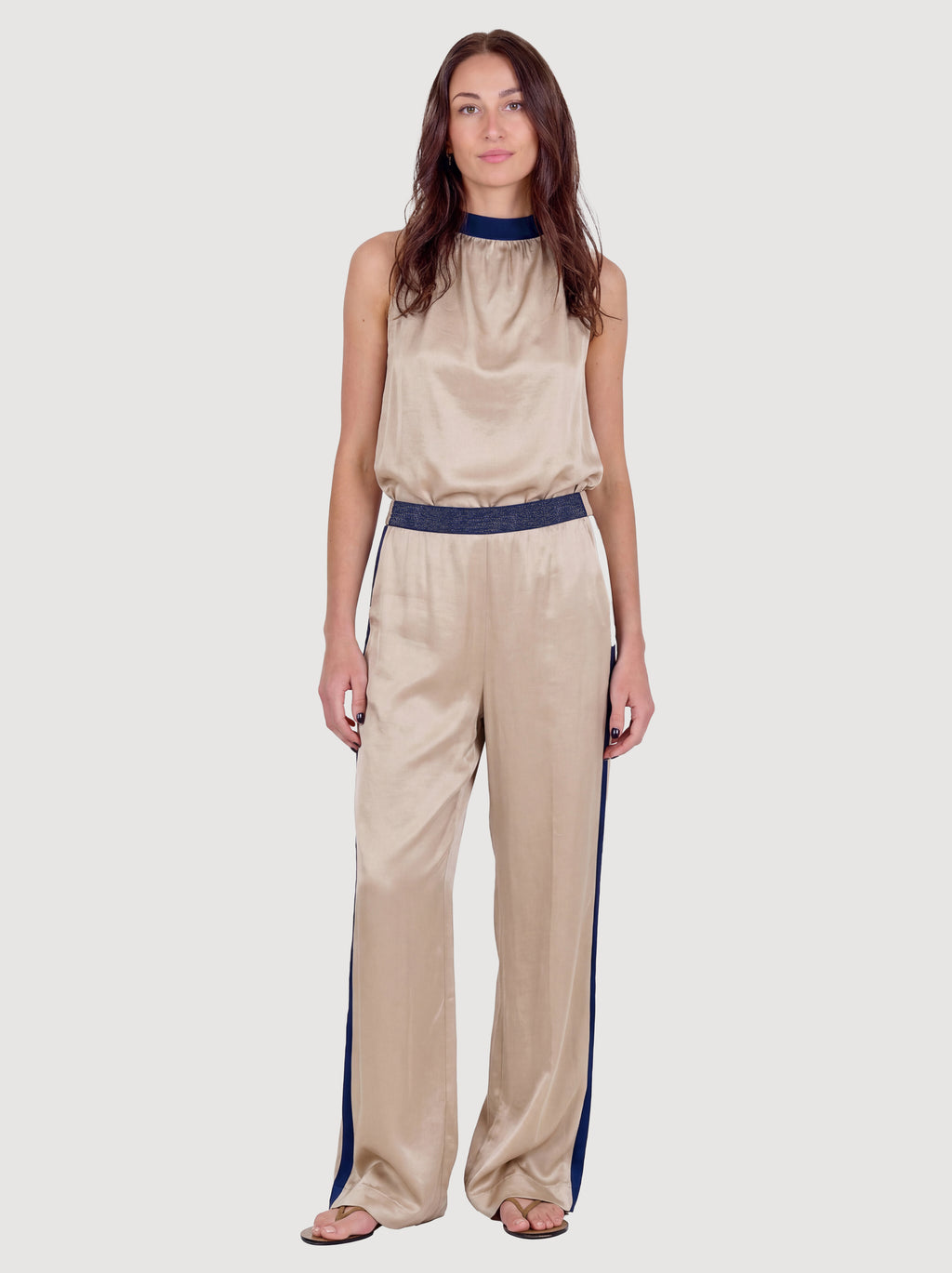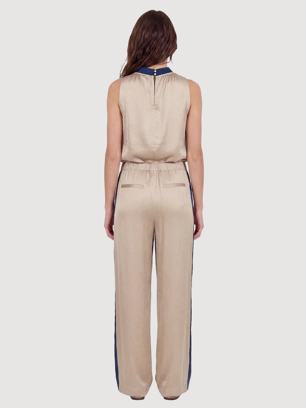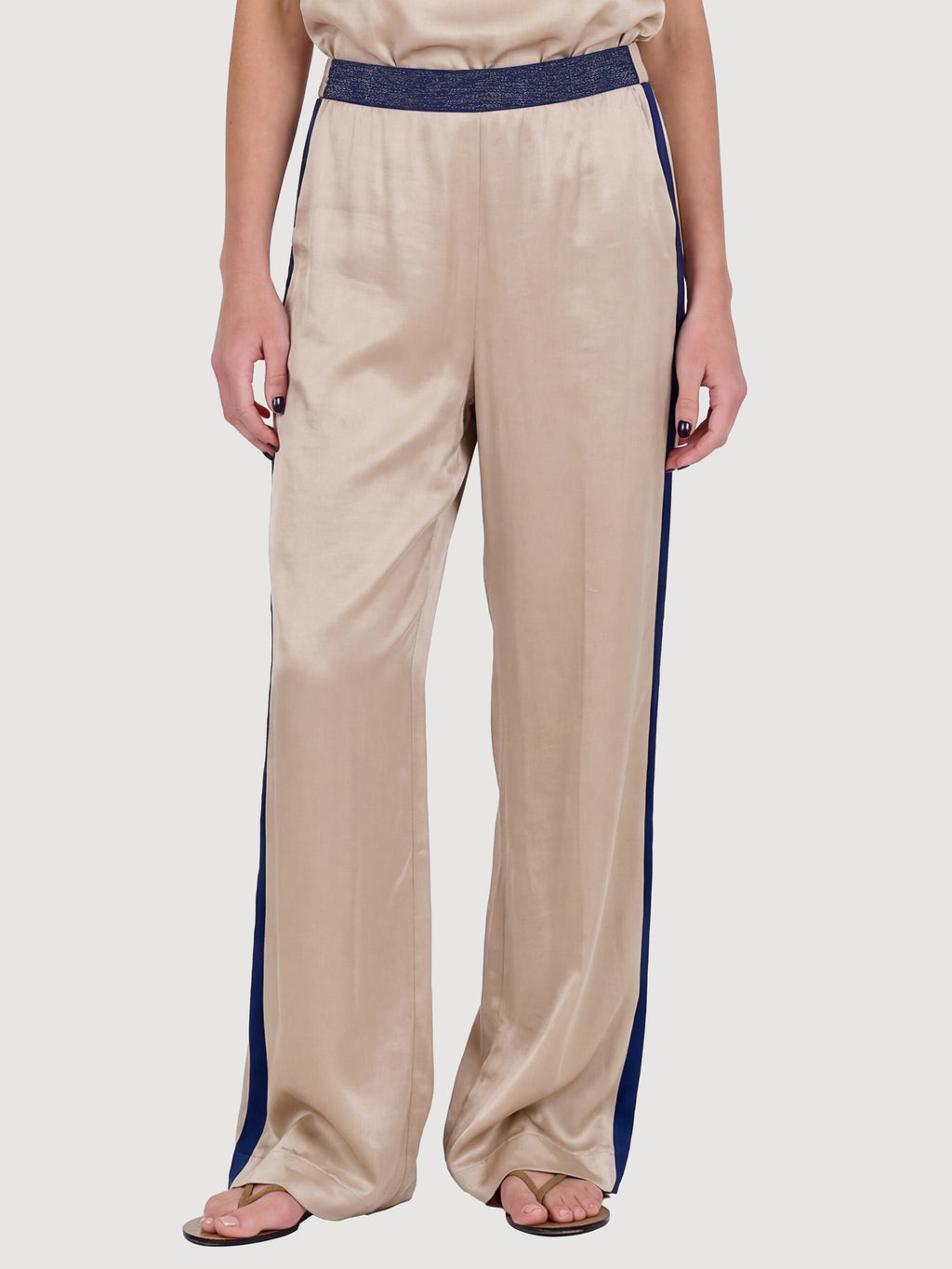 These trousers are made from a lightweight viscose blend with a subtle sheen, creating an elegant and flowing drape. They feature long, straight legs and a simple silhouette, while the contrast detail at the waist and along the sides adds a modern twist.