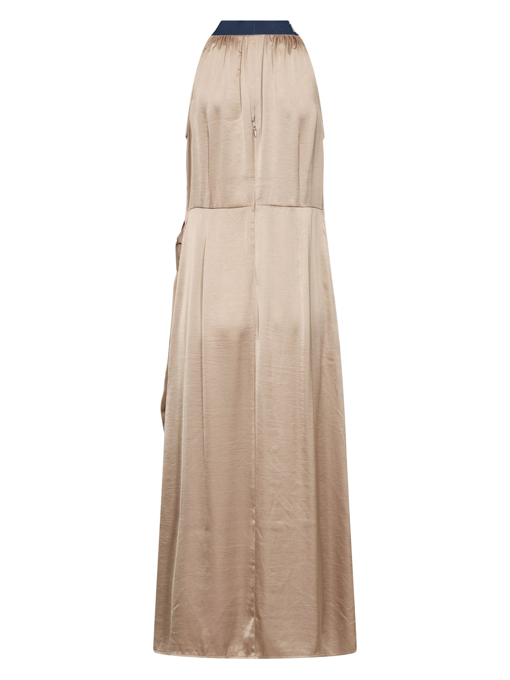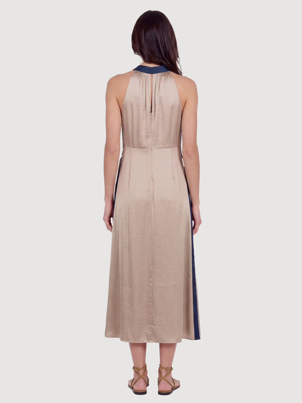 This dress is made from a soft viscose blend with a subtle sheen, which provides an elegant and flowing drape. It features a high neckline with elastic edge, creating a modern look, while the contrast details along the sides add a graphic twist.