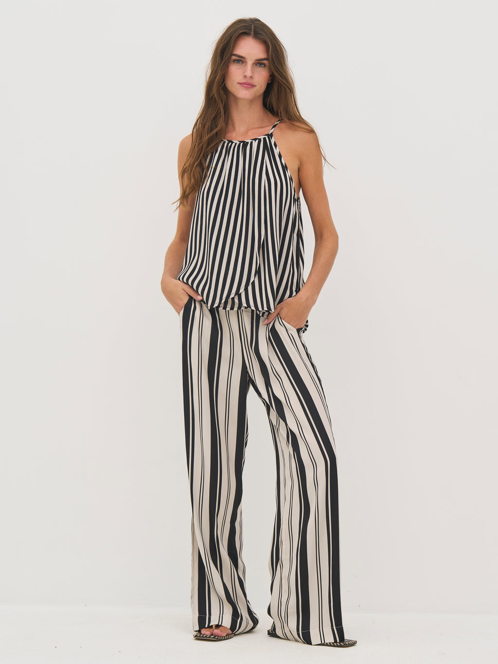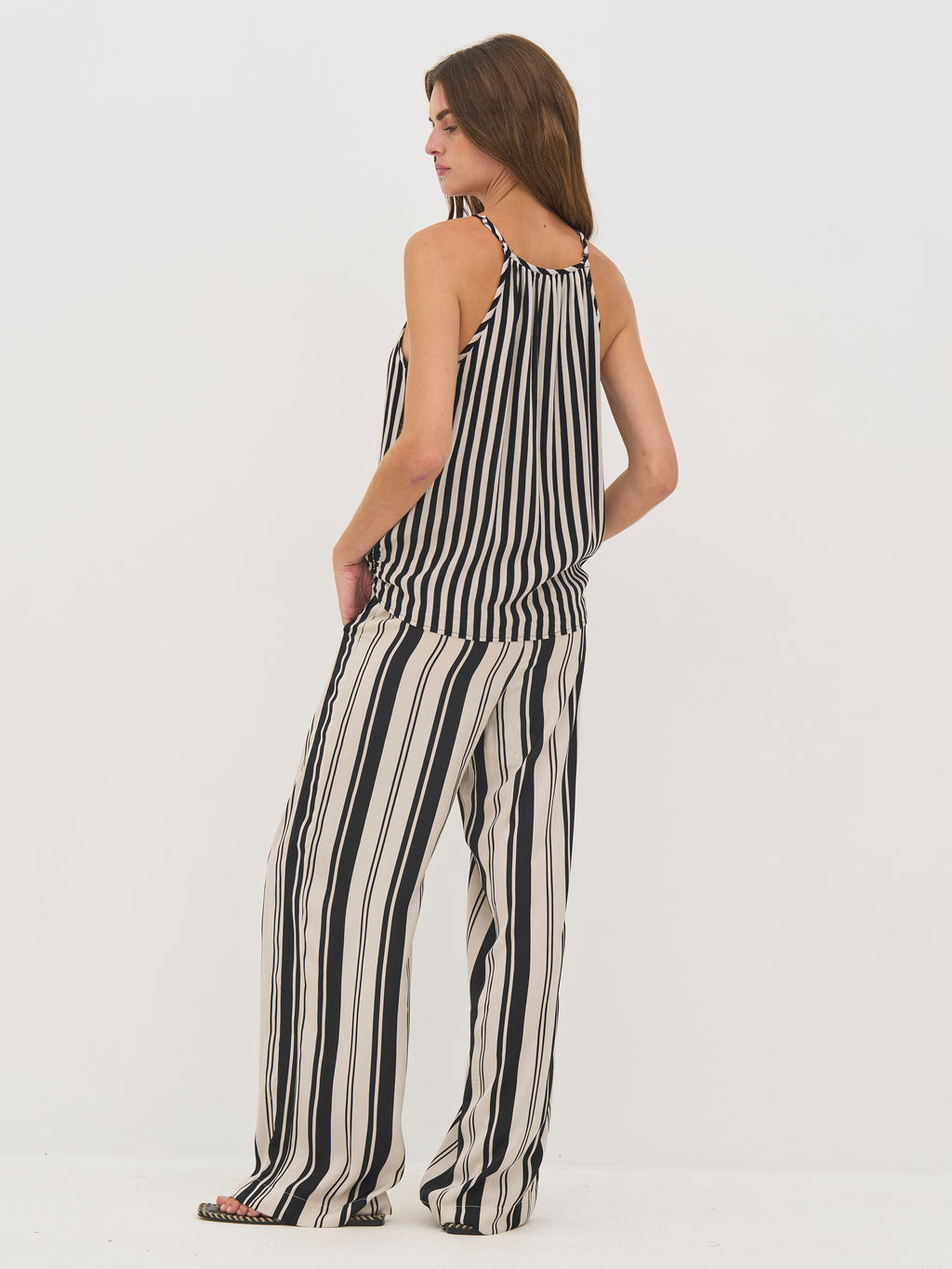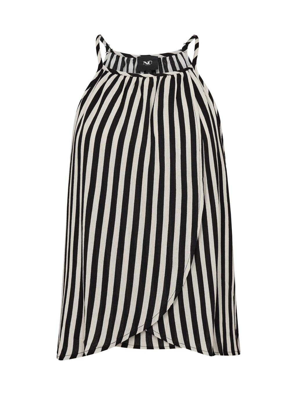 This top is made of a light crepe viscose that gives a soft and airy drape. It features a sleeveless silhouette with delicate, adjustable straps ensuring a flexible fit. The elegant wrap effect at the front creates a feminine and airy look, while the stripes add a modern touch.