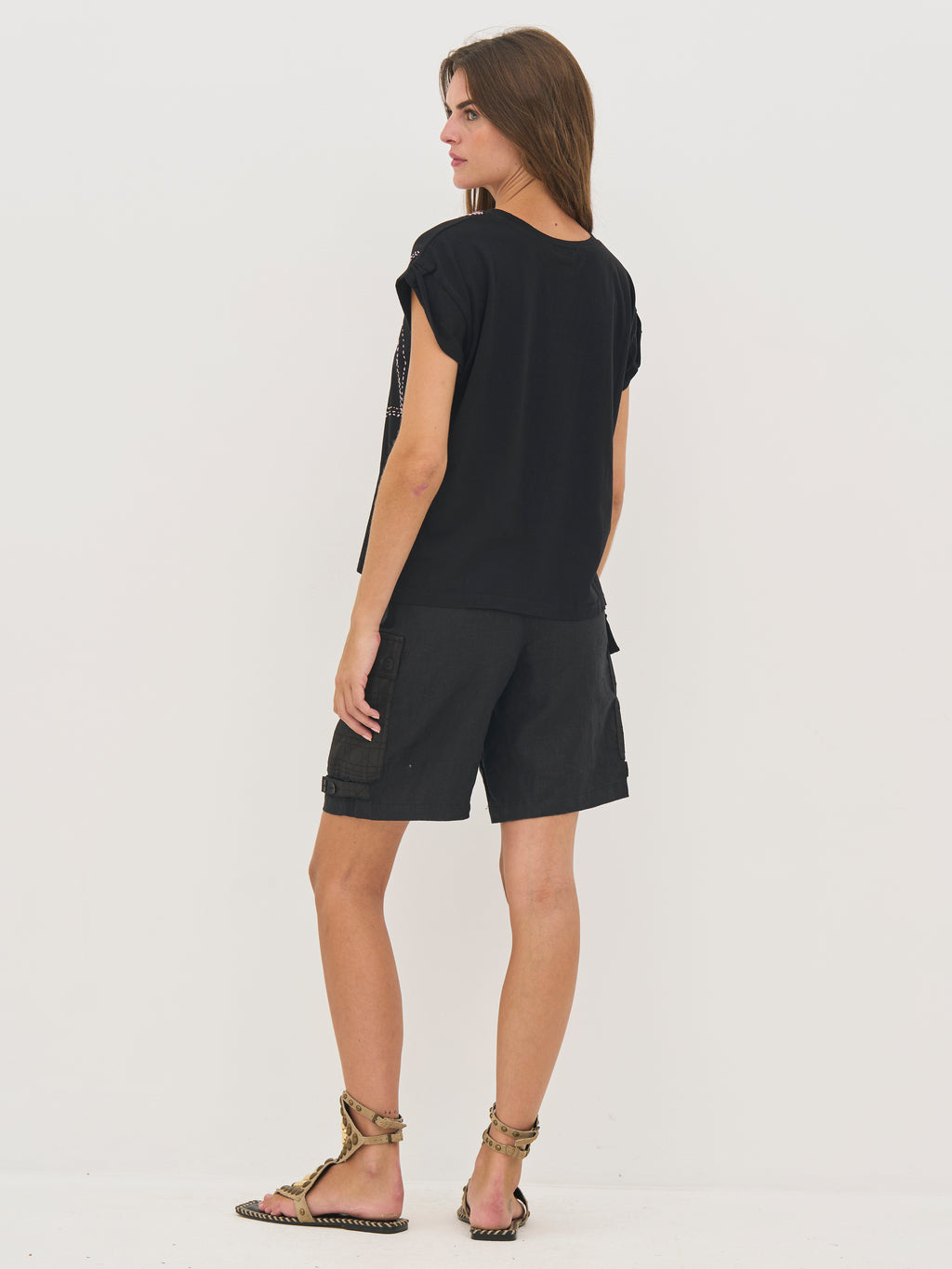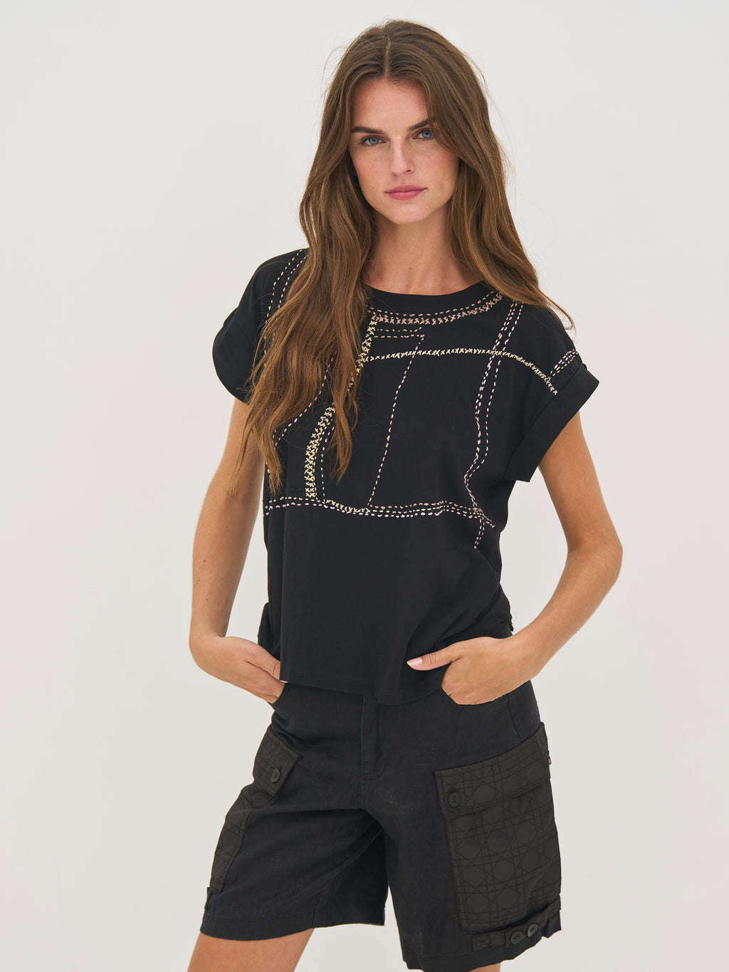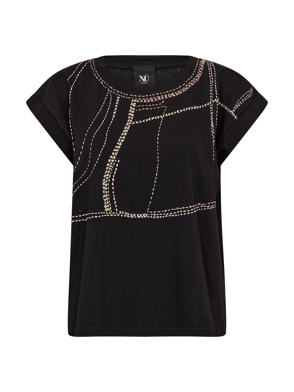 This T-shirt is made of a soft cotton quality, making it comfortable and breathable for everyday use. It has a simple and timeless look with a round neckline and a straight fit that falls smoothly along the body. The rolled-up short sleeves give a relaxed touch, while the decorative embroidery at the front adds a unique and graphic element. The back design is kept simple. Style the T-shirt with jeans or a skirt for an effortless everyday look, or wear it under a jacket for a layered expression.