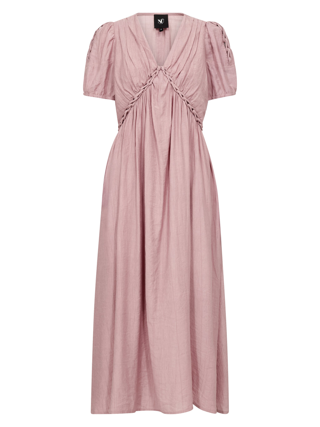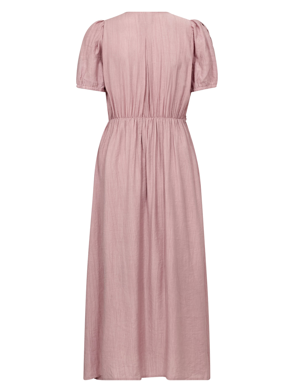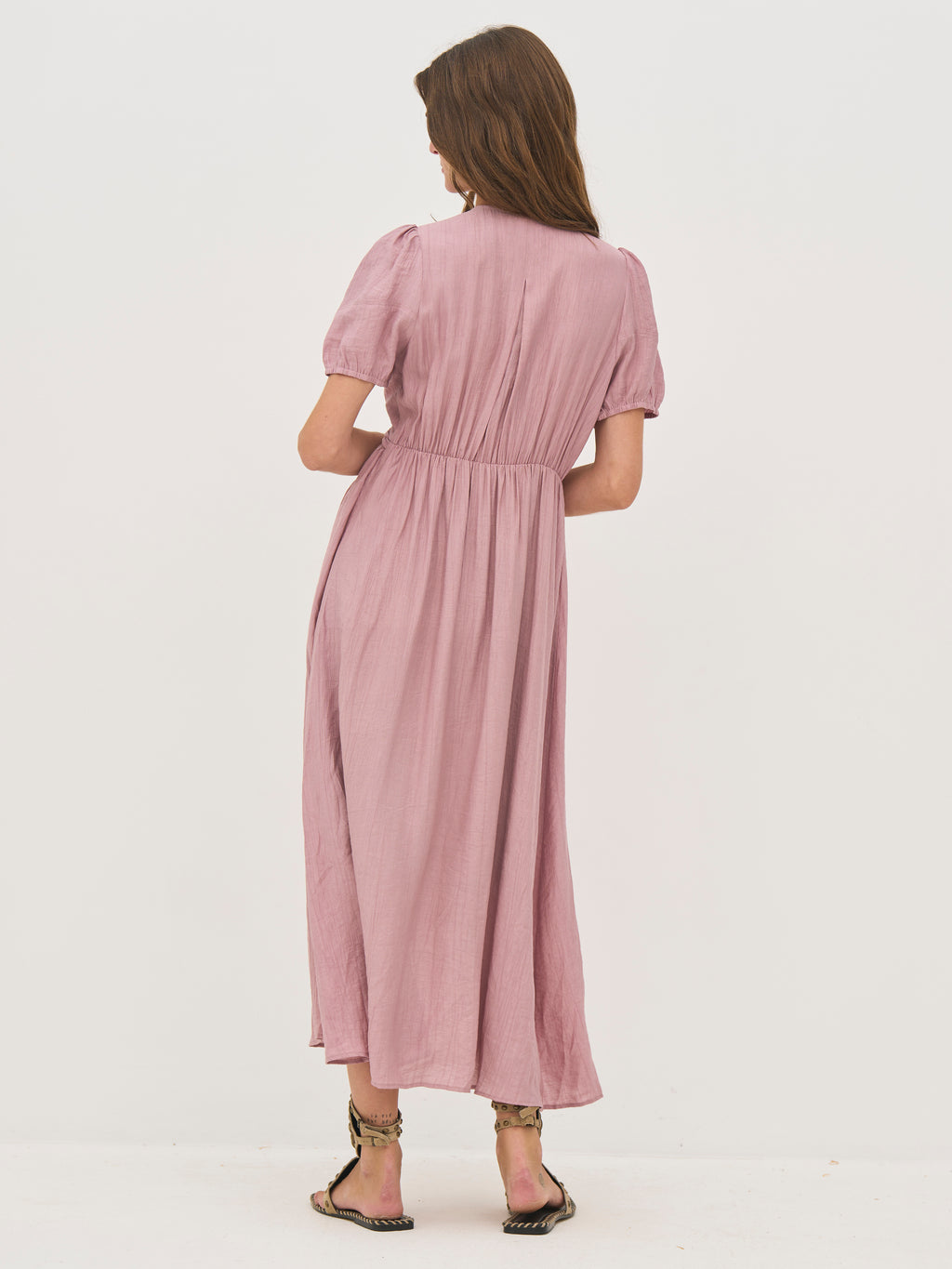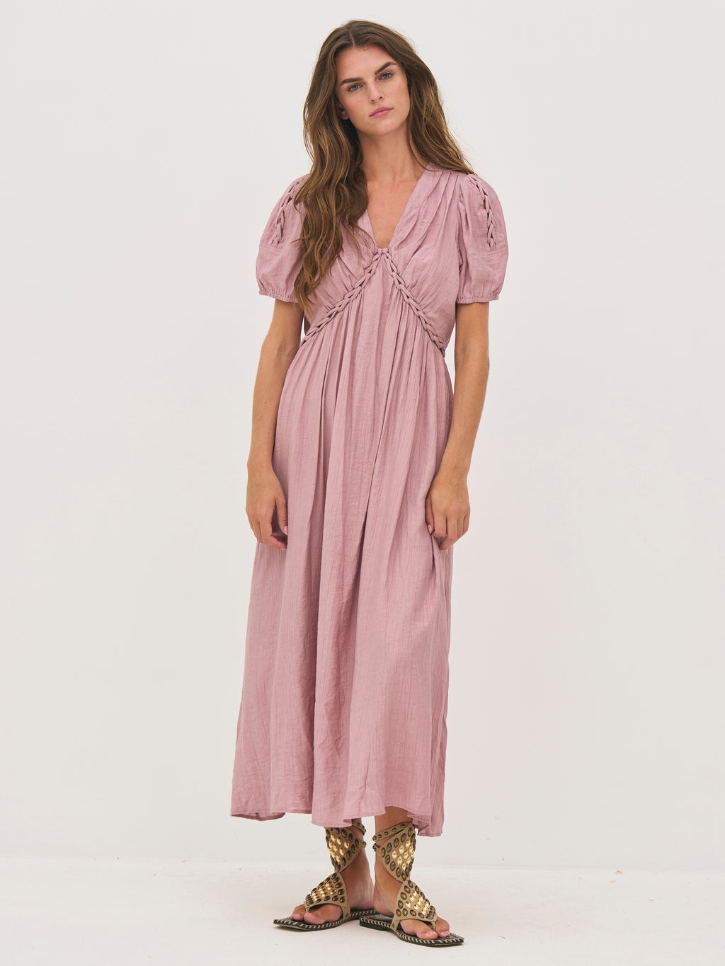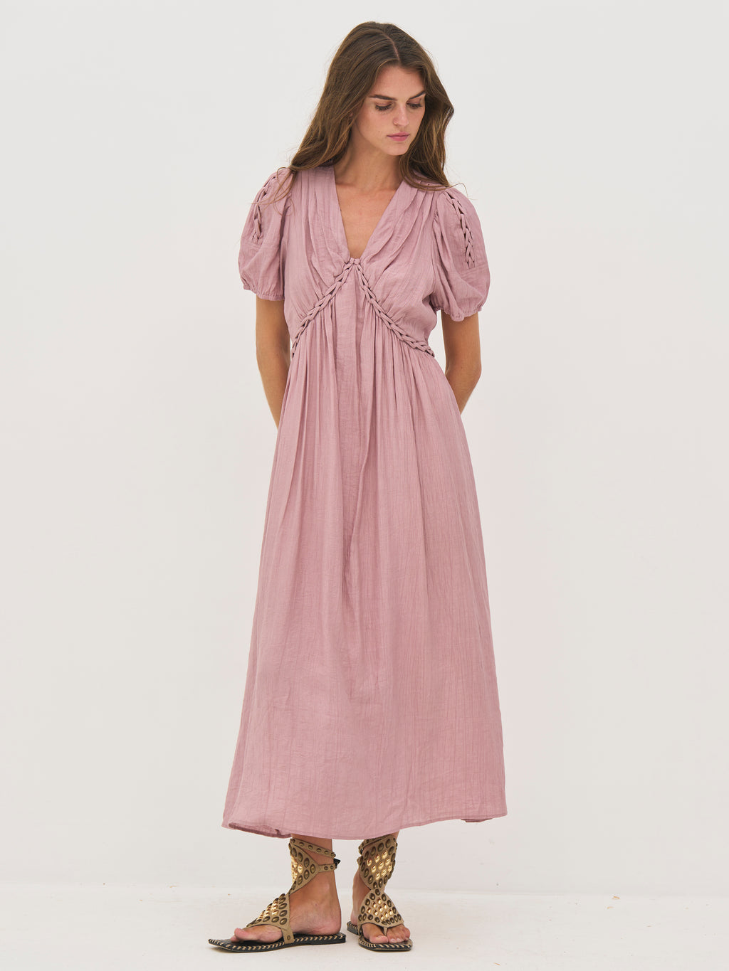 This dress is made from a light viscose blend with crepe, giving it a soft and airy drape. It features a V-neckline with a braided detail at the front that adds structure and a feminine touch. The short puff sleeves with delicate details emphasize the light and elegant look.