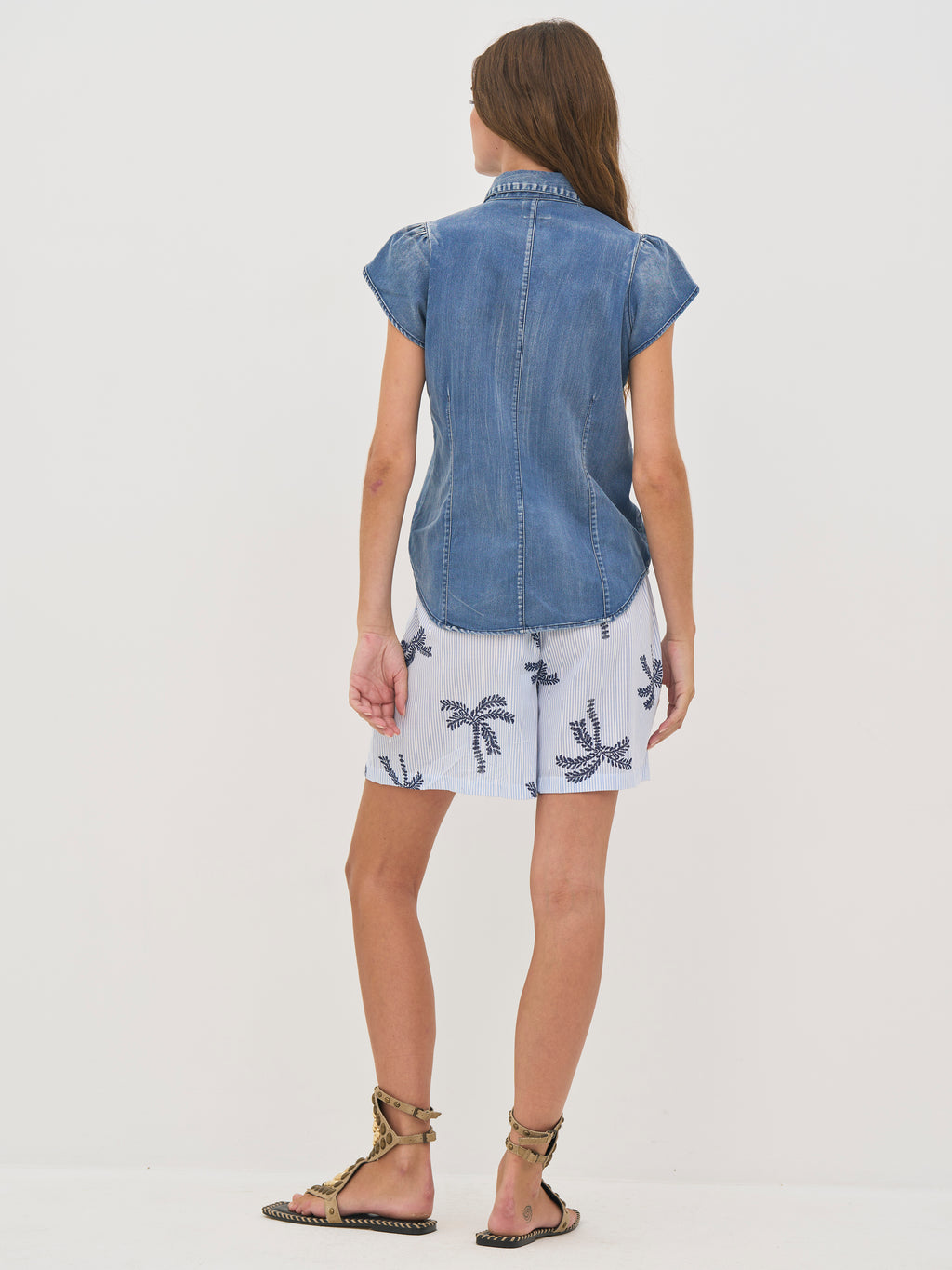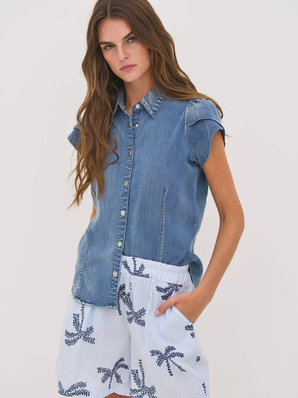 This shirt is made of soft cotton denim with stretch, providing a comfortable and flexible fit. It features a classic shirt collar and closes with snap buttons at the front, giving a simple and functional look. The short sleeves with a slight puff detail add a feminine touch, while the slightly tailored fit accentuates the silhouette. The back of the design is kept simple and stylish.