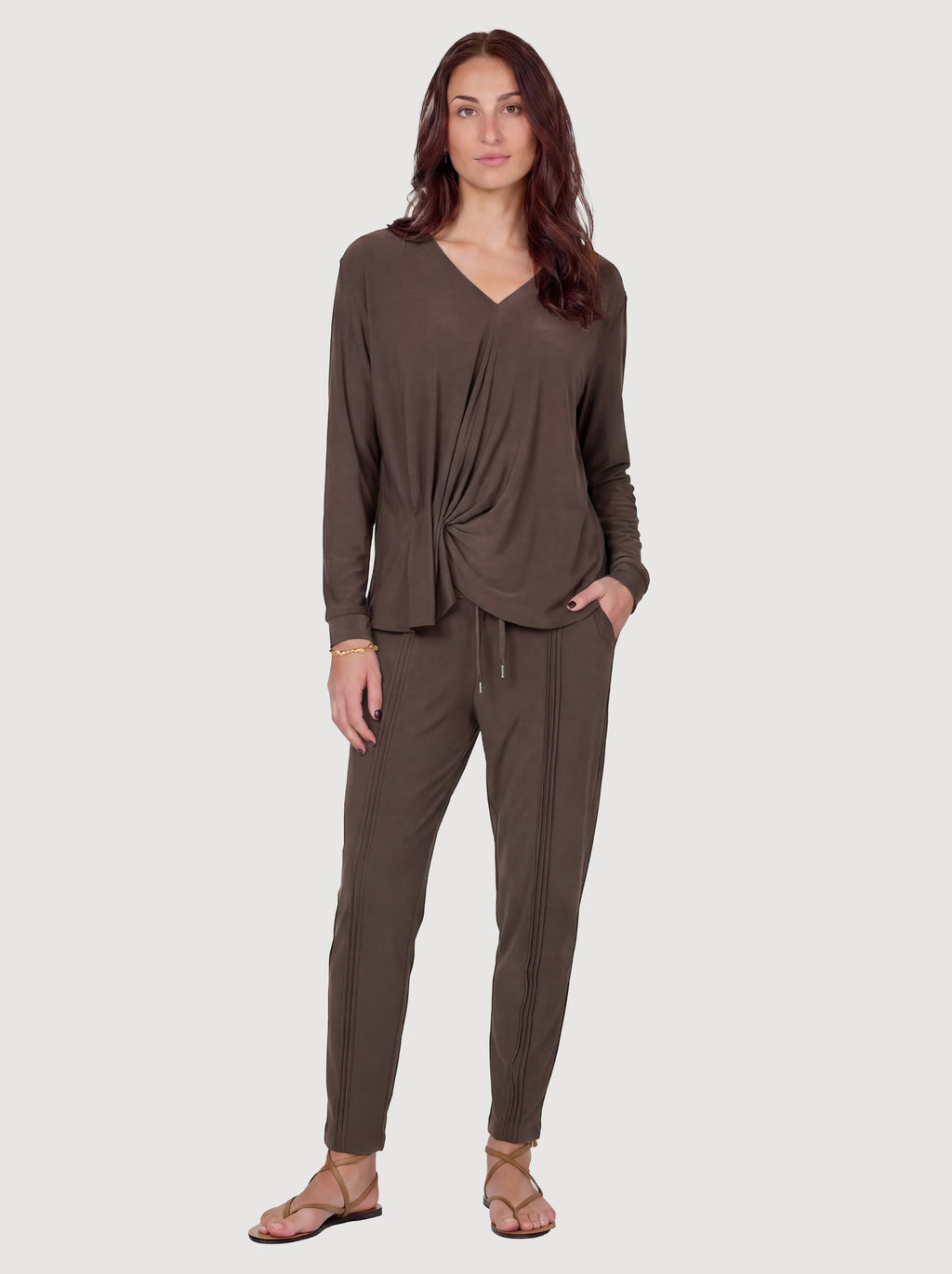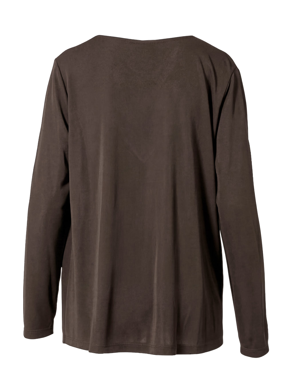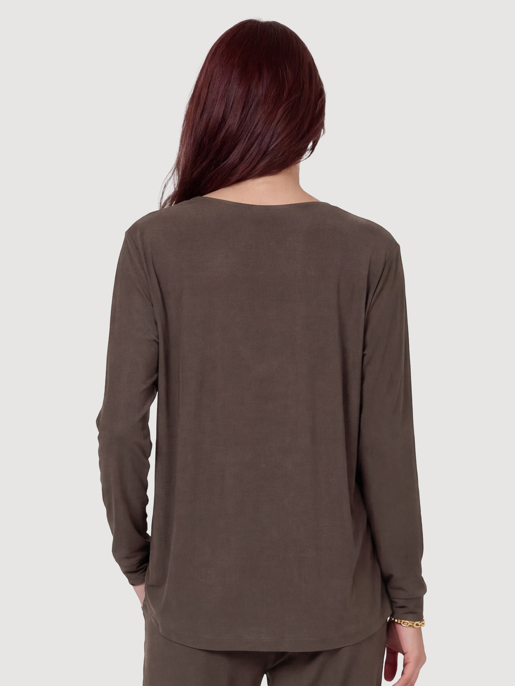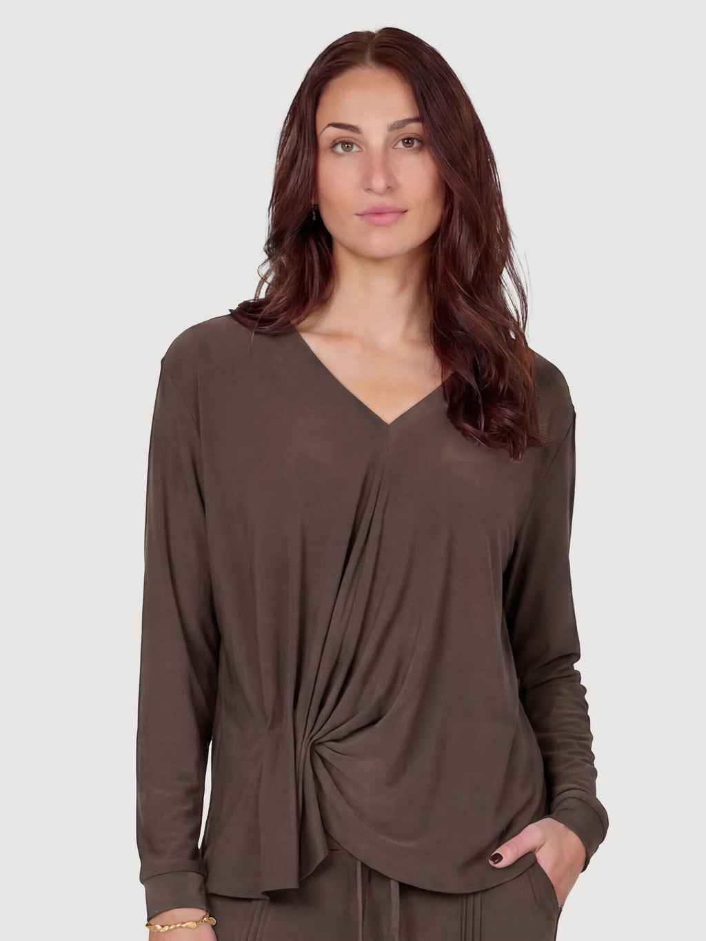 This blouse has an elegant and relaxed look with a loose fit and a soft drape. At the front, the design is accentuated by a flattering V-neck and a draped detail that creates a natural movement in the fabric. The design falls gently along the body, while the back is kept simple for a harmonious and stylish expression.